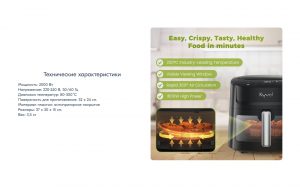 Высокая мощность – 1800 Вт позволяет аэрогриль электрический с решеткой пропекать даже толстые куски мяса, получая только прожаренный и вкусный продукт.