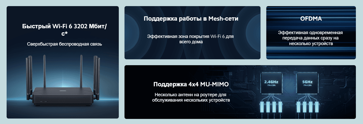 Xiaomi Router AX3200 работает на двух частотах: 2,4 ГГц и 5 ГГц. Две частоты не создают взаимных помех и имеют максимальную теоретическую скорость беспроводного соединения на уровне 3202 Мбит/с. Насладитесь сверхбыстрым Интернетом, стабильным покрытием сети, высокой скоростью, плавным воспроизведением HD-видео и играм в высоком разрешении.
