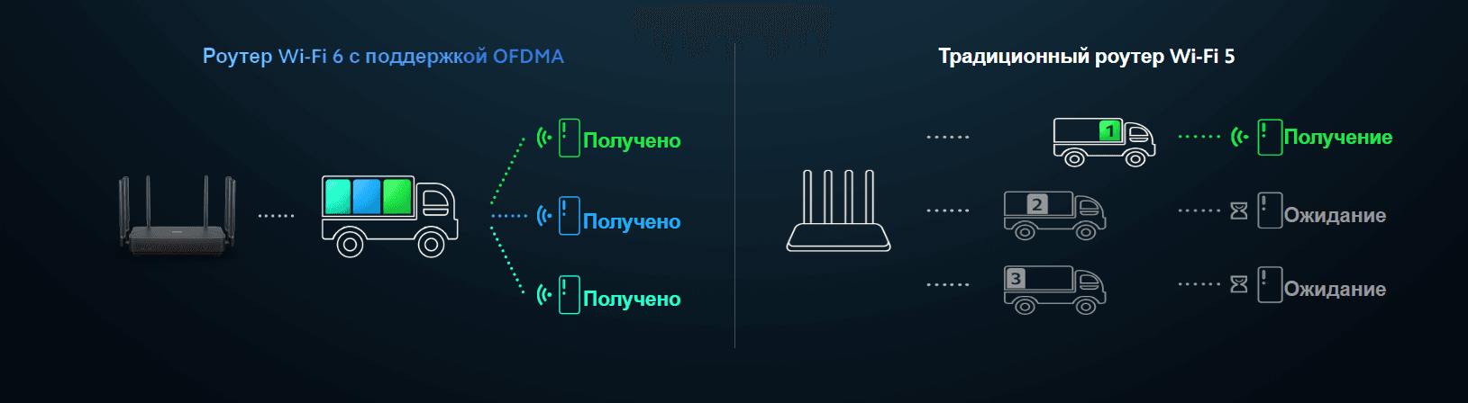 Технология OFDMA позволяет роутеру отправлять данные на несколько оконечных устройств одной передачей, когда традиционному роутеру приходится отправлять несколько передач. OFDMA обеспечивает более эффективную передачу данных и уменьшает время задержки, что позволяет одновременно использовать несколько устройств и наслаждаться мгновенным временем отклика в онлайн-играх как на смартфоне, так и в более широких форматах (ПК, консоли).