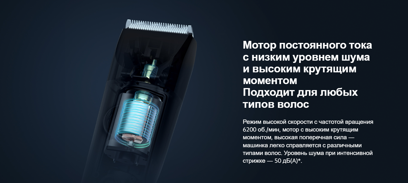 Режим высокой скорости с частотой вращения 6200 об./мин, мотор с высоким крутящим моментом, высокая поперечная сила — машинка легко справляется с различными типами волос. Уровень шума при интенсивной стрижке — 50 дБ(A).