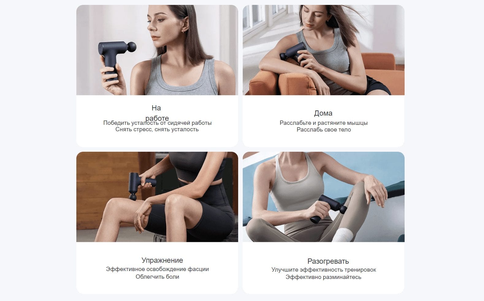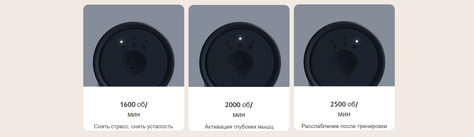 3 режима массажа для удовлетворения всех потребностей в релаксации, от обычного ухода за мышцами до глубокого массажа после тренировки. Специализированное лечение для защиты здоровья мышц.