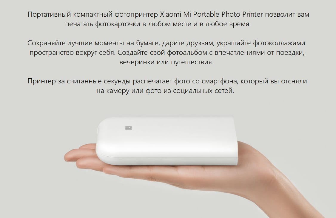 Портативный компактный фотопринтер Xiaomi Mi Portable Photo Printer позволит вам печатать фотокарточки в любом месте и в любое время. Сохраняйте лучшие моменты на бумаге, дарите друзьям, украшайте фотоколлажами пространство вокруг себя. Создайте свой фотоальбом с впечатлениями от поездки, вечеринки или путешествия. Принтер за считанные секунды распечатает фото со смартфона, который вы отсняли на камеру или фото из социальных сетей.