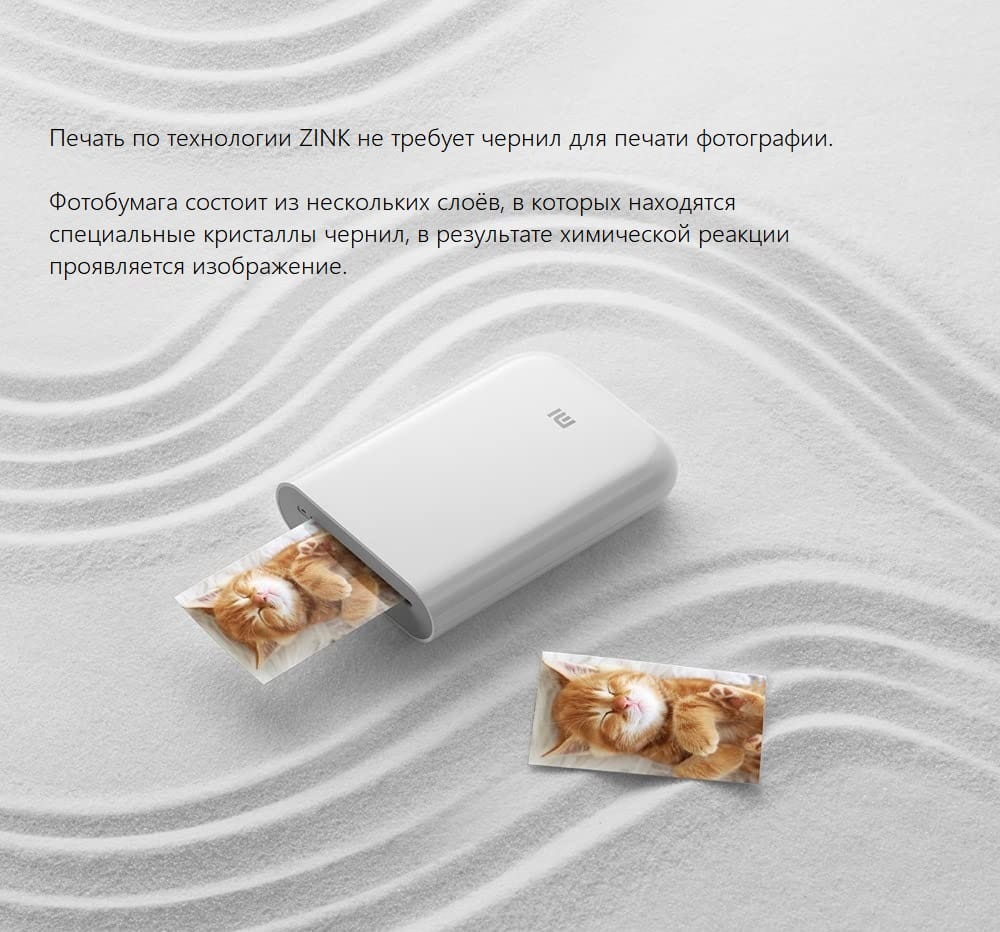 Печать по технологии ZINK не требует чернил для печати фотографии. Фотобумага состоит из нескольких слоёв, в которых находятся специальные кристаллы чернил, в результате химической реакции проявляется изображение.