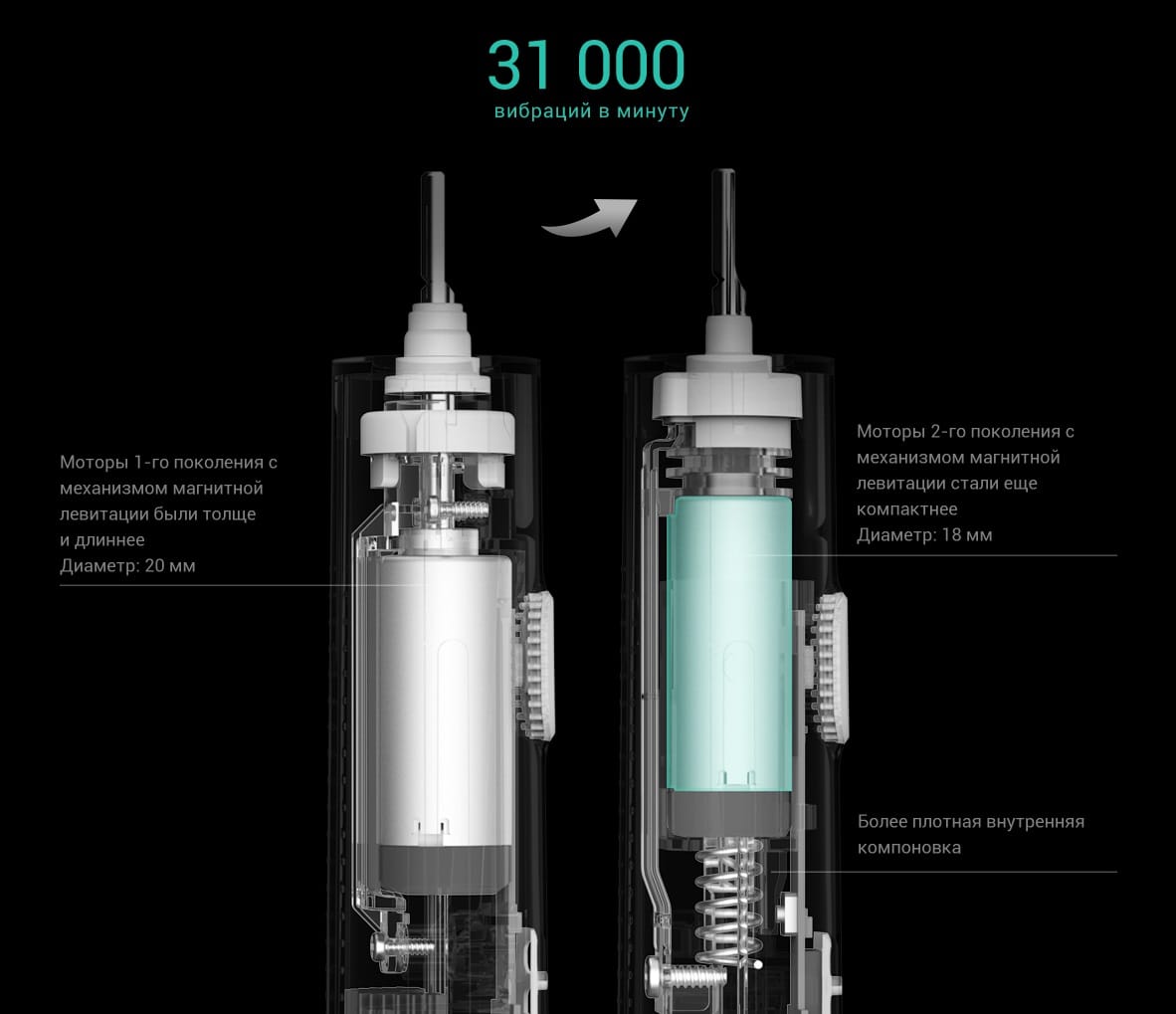 Оцените возможности ультразвукового мотора 2-го поколения с механизмом магнитной левитации, который был разработан независимыми экспертами из Германии и Японии. Щетка вибрирует с частотой 31 000 движений в минуту и легко удаляет даже въевшуюся желтизну на зубах. После обновления мотор стал меньше, издает меньше шума и слабее вибрирует, обеспечивая при этом более комфортную чистку.