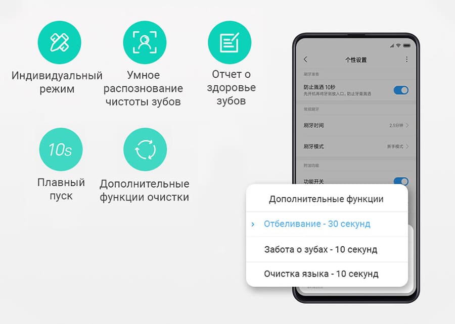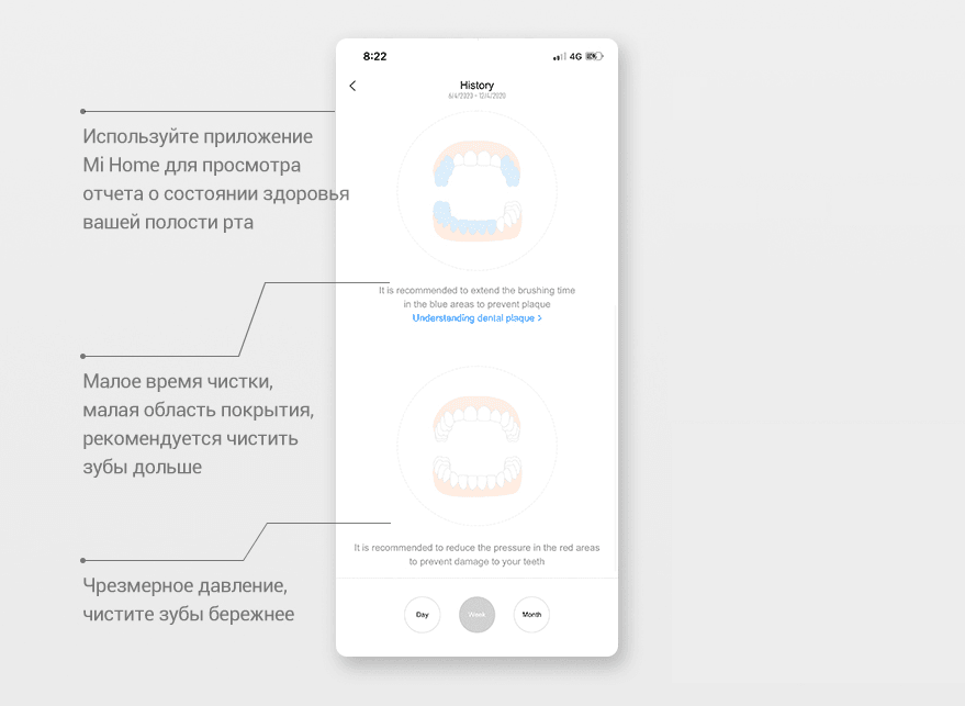Высокоточный датчик ускорения позволяет точнее контролировать положение, угол и рабочую область щетки. Откройте приложение, чтобы посмотреть данные для каждого режима чистки, включая количество чрезмерных усилий, время чистки, область покрытия, а также ежедневную, еженедельную и ежемесячную статистику и рекомендации по уходу за полостью рта.