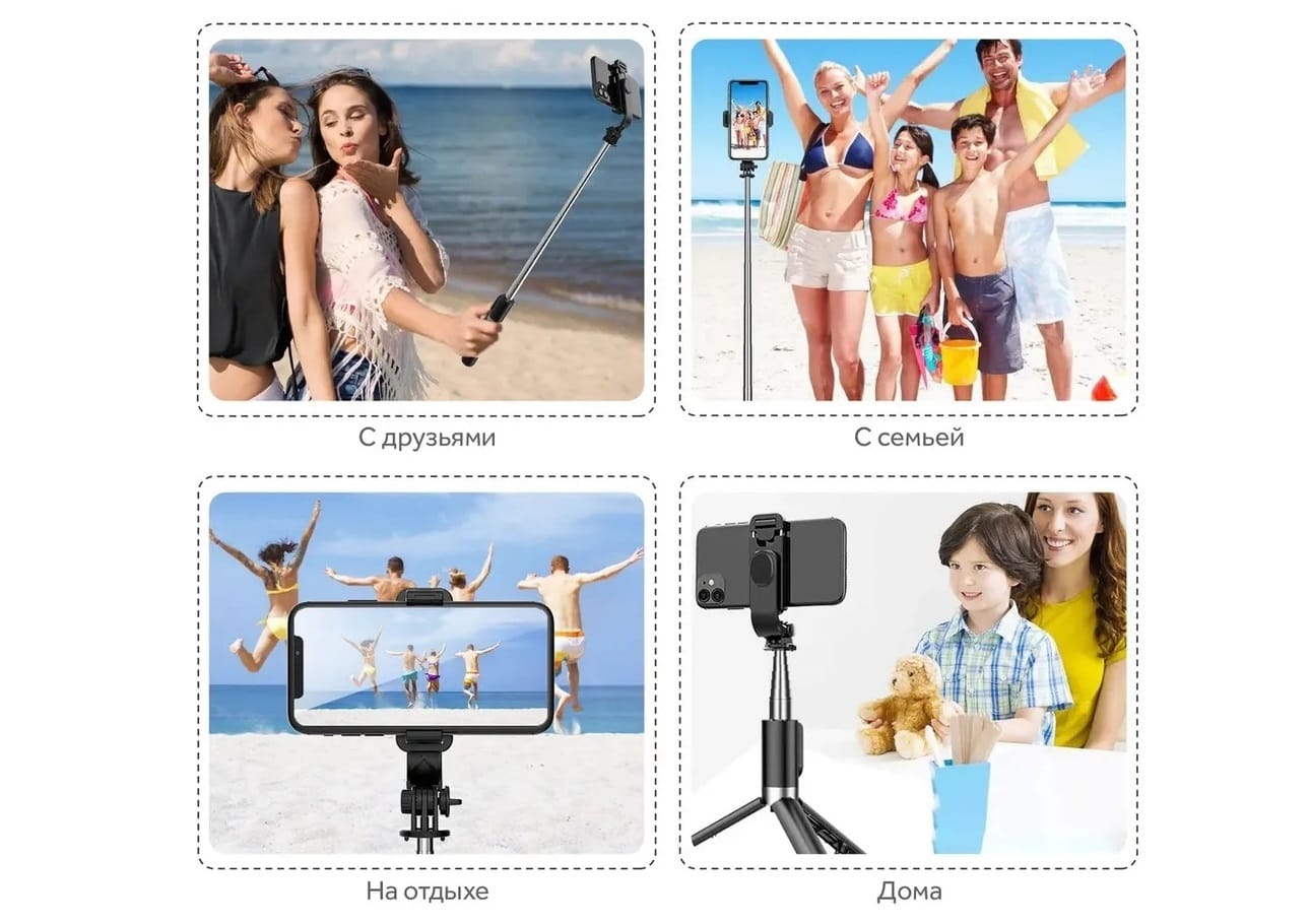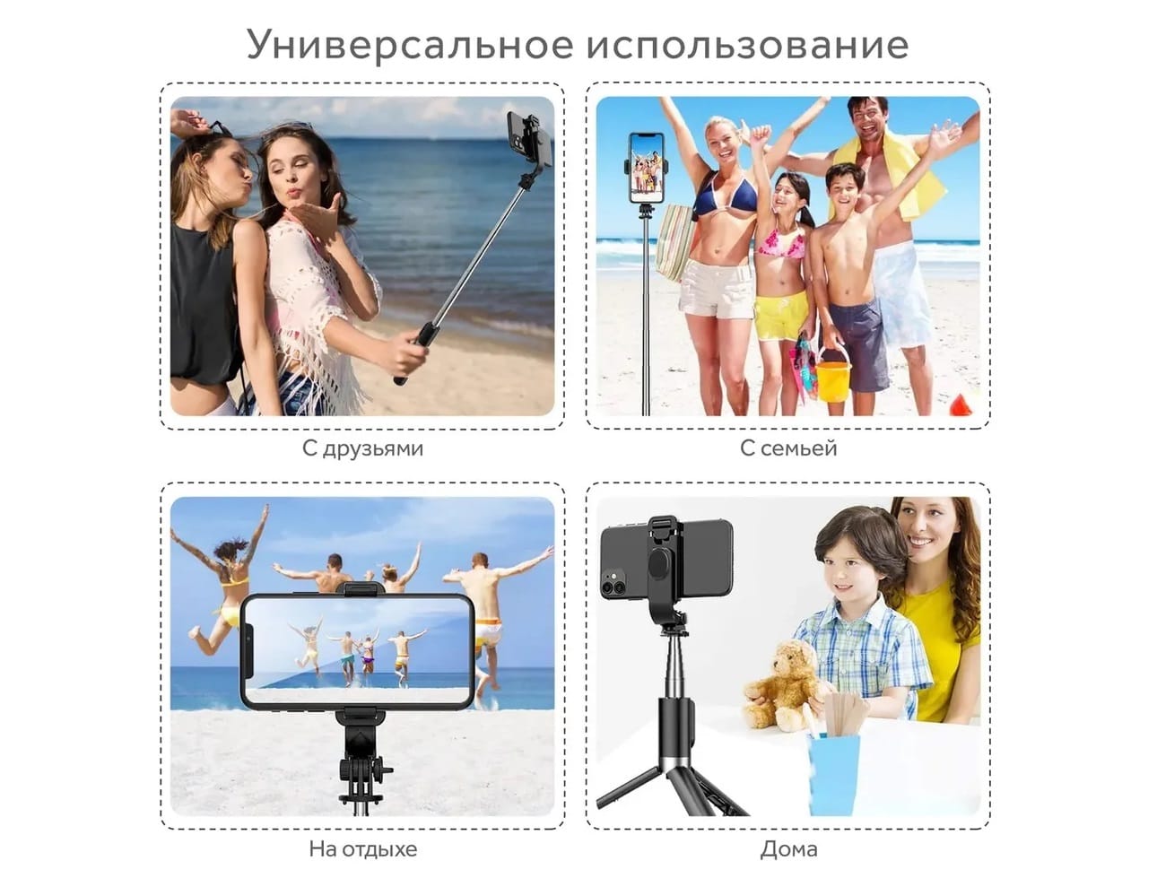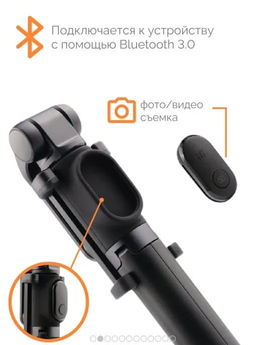 Монопод имеет Bluetooth-пульт дистанционного управления, который позволяет делать снимки на расстоянии от смартфона. Кроме того, установив монопод на треноге и используя пульт, вы избежите смазывания снимка из-за дрожания рук.