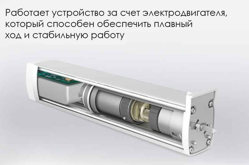 Монтаж устройства не требует профессиональных знаний и инструментов, поэтому его можно выполнить самостоятельно. Оно фиксируется к боковой части карниза и не привлекает к себе лишнего внимания благодаря лаконичности дизайна.