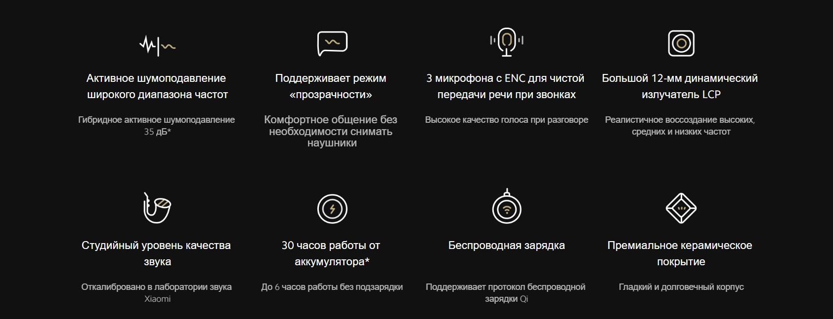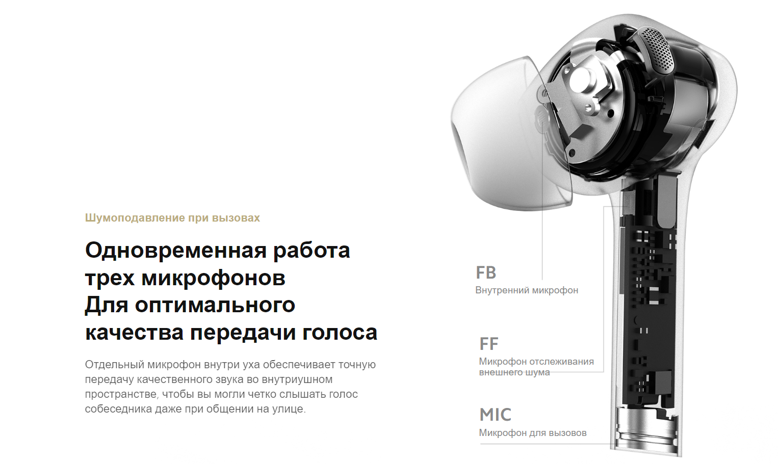 Для шумоподавления используются два микрофона — один отслеживает внешний шум, а второй обрабатывает их перед тем, как пустить в ухо. Такая система позволяет достичь эффективности гибридного шумоподавления до 35 дБ. Уникальный большой резонатор справится и с высокочастотным шумом (1000–3000 Гц), например криком, звуками стройки и громким грохотом.