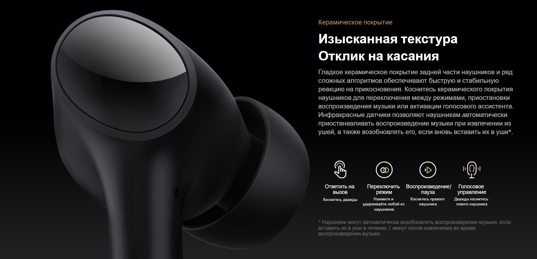 В режиме восприятия внешних звуков вы сможете четко слышать звуки окружения без необходимости извлекать наушники из ушей. Конструкция наушников обеспечивает отсутствие лишнего давления на уши, что позволит без труда общаться с другими людьми, не снимая наушники.