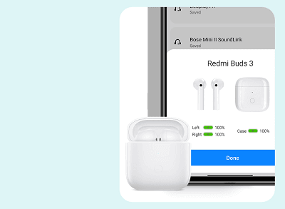 Эксклюзивное всплывающее окно MIUI для быстрого сопряжения позволяет быстро выполнять сопряжение устройств. Просто откройте крышку кейса для зарядки рядом со смартфоном и коснитесь экрана, когда появится всплывающее окно. На экране сразу появится уровень заряда аккумулятора наушников и зарядного кейса.