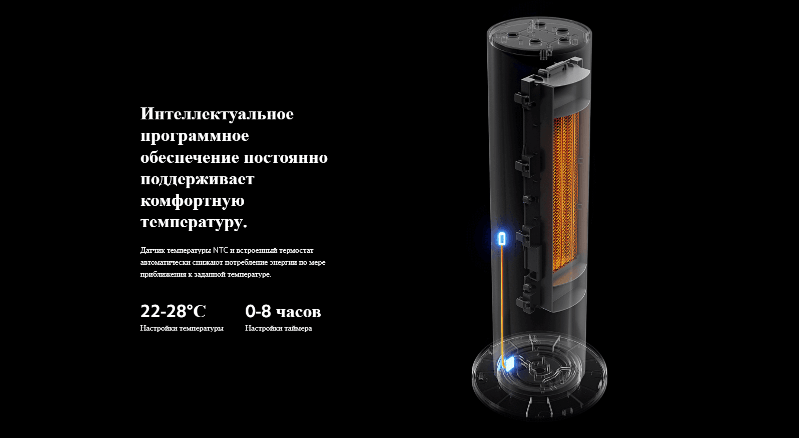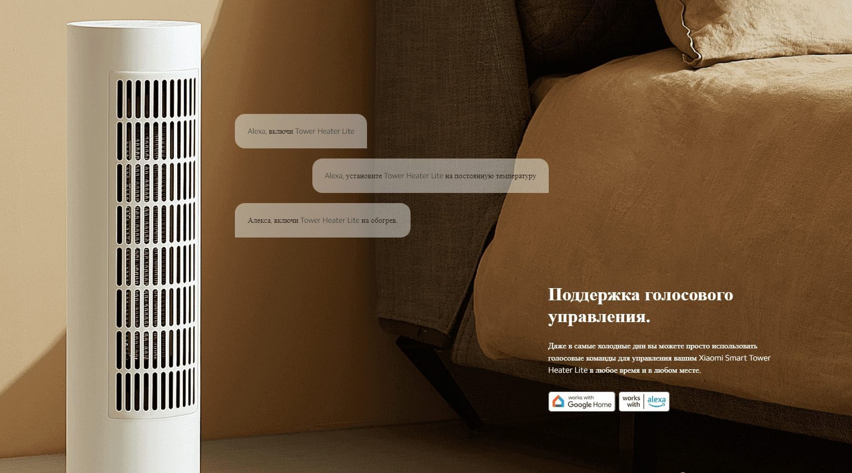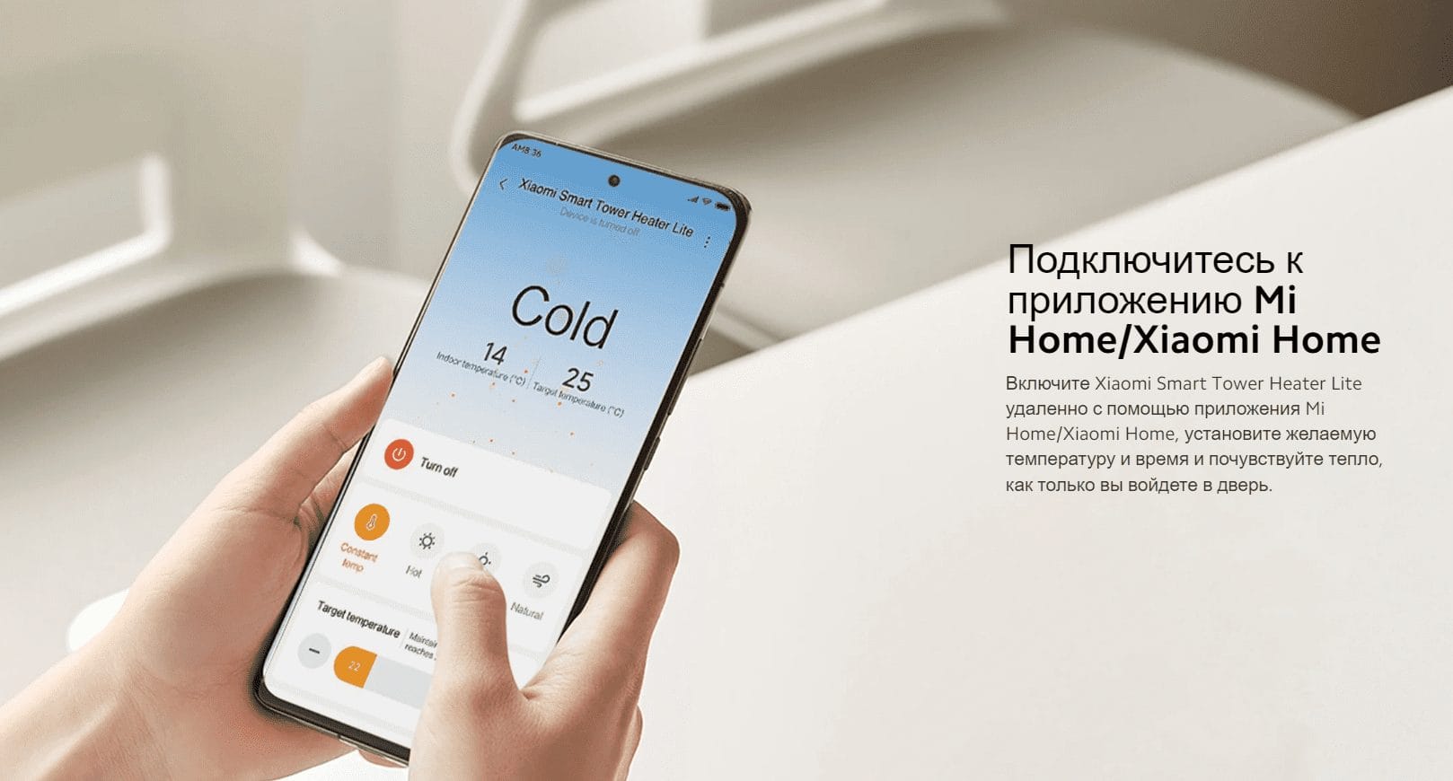 Управляйте Xiaomi Smart Tower Heater Lite дистанционно с помощью голосовых команд или с помощью смартфона. Расстояние не помеха.