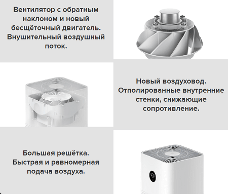 С тех пор как Xiaomi представила свой первый очиститель воздуха в 2014 году, они не переставая трудились над увеличением производительности устройства. Главной задачей являлось увеличение мощности очистителя воздуха без увеличения размеров корпуса. Инженерам удалось справиться с ней. Система воздуховода устройства была полностью переработана, что обеспечило увеличение скорости очистки на 22% до 380 м³/ч.