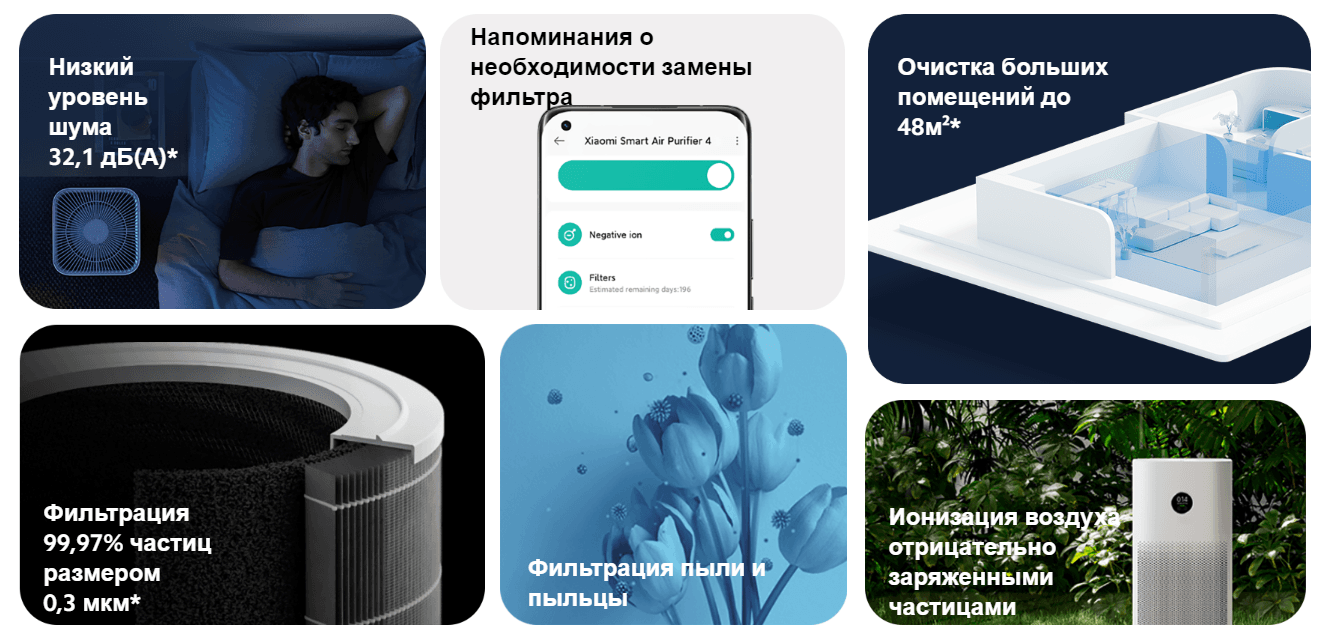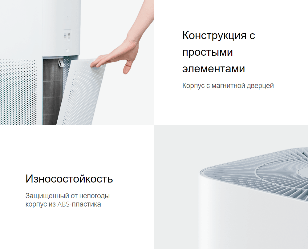Две технологии фильтрации: Электростатический заряд и механическая фильтрация — высокоэффективный фильтр Xiaomi может удалять до 99,97% содержащихся в воздухе частиц размером 0,3 мкм, а также задерживает пыль, частицы PM2.5, пыльцу, перхоть домашних животных, табачный дым и мельчайшие частицы.
