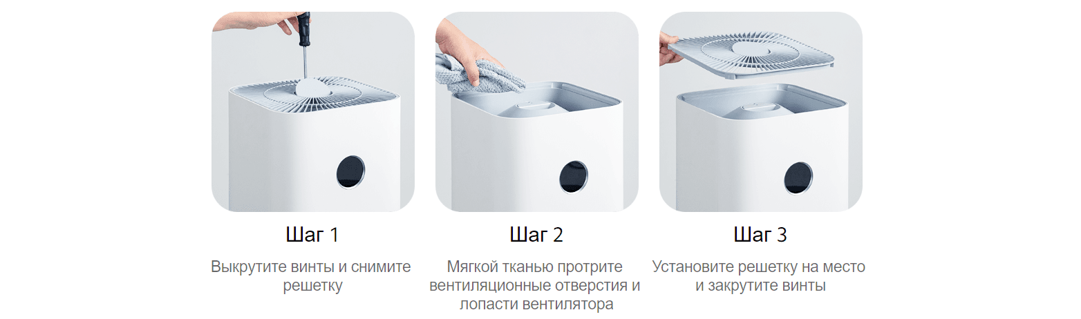 Для защиты детей верхняя решетка прикручена винтами и не может быть снята случайно. Выкрутите винты и снимите решетку для простого доступа к лопастям вентилятора и вентиляционным отверстиям. Выполните очистку внутренних компонентов очистителя, чтобы избежать загрязнения воздуха.