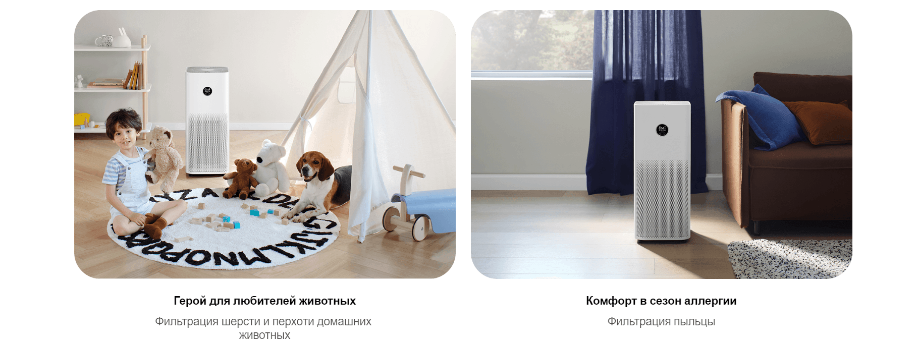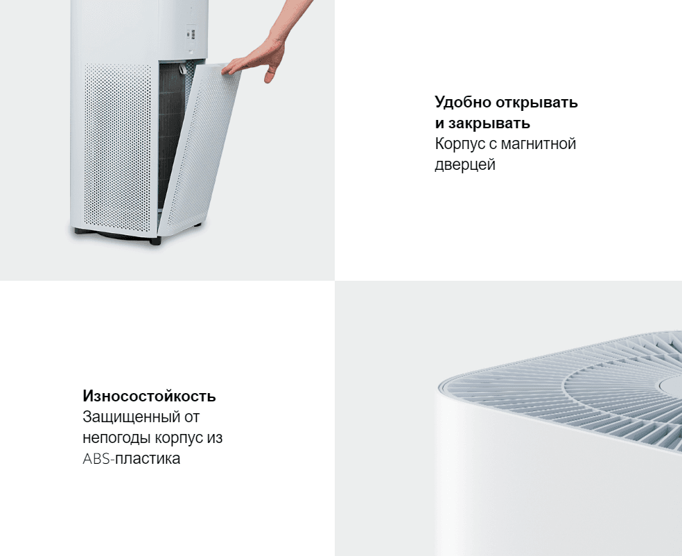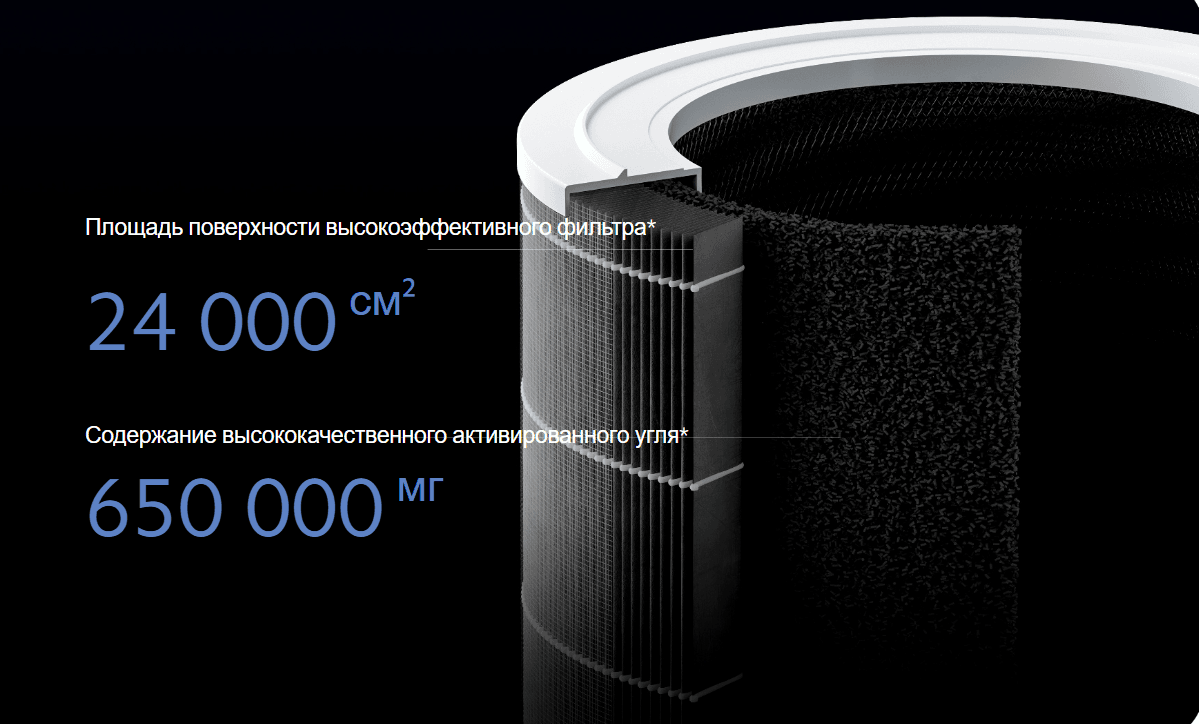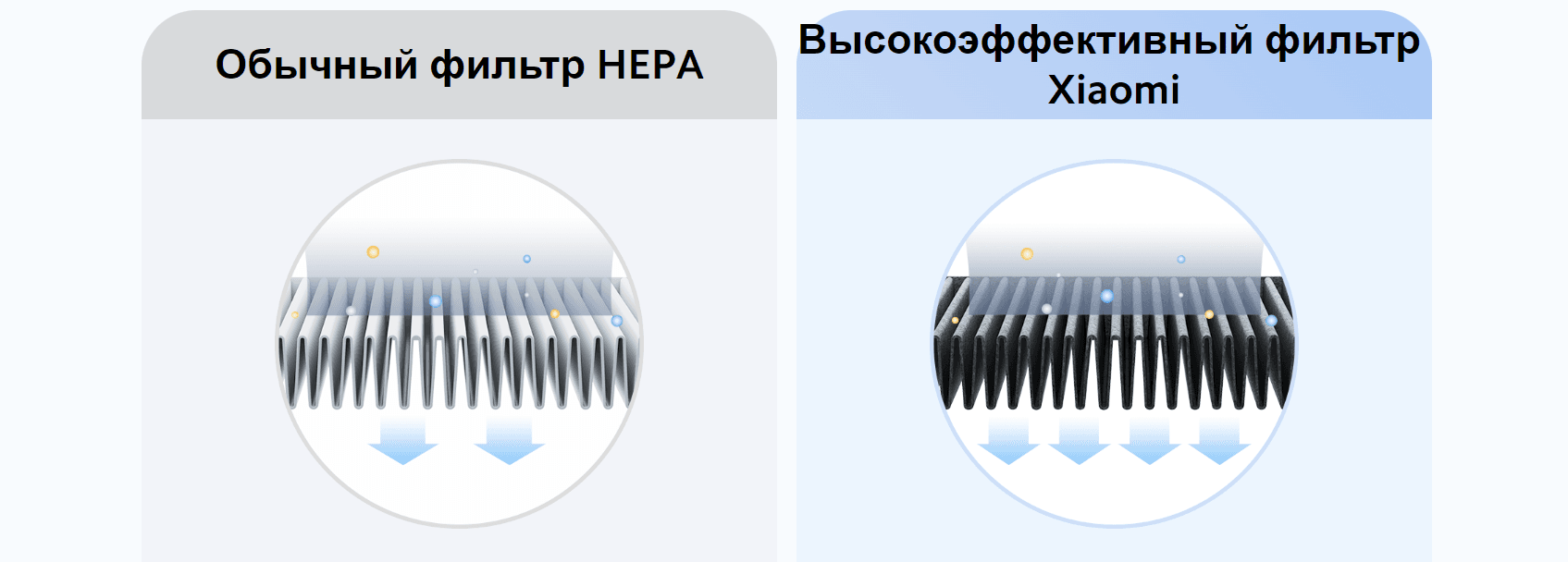 Две технологии фильтрации: электростатический заряд и механическая фильтрация — высокоэффективный фильтр Xiaomi может удалять до 99,97% содержащихся в воздухе частиц размером 0,3 мкм, а также задерживает пыль, частицы PM2.5, пыльцу, перхоть домашних животных, табачный дым и мельчайшие частицы.