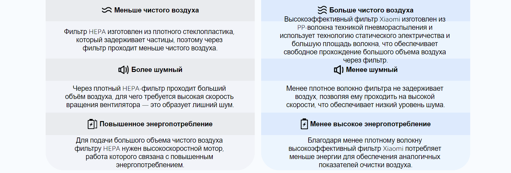 По сравнению с обычным HEPA-фильтром высокоэффективный фильтр Xiaomi позволяет очистителю воздуха работать тише и потреблять меньше энергии, обеспечивая прохождение большего потока воздуха через фильтр и сохраняя при этом эффективность очистки.