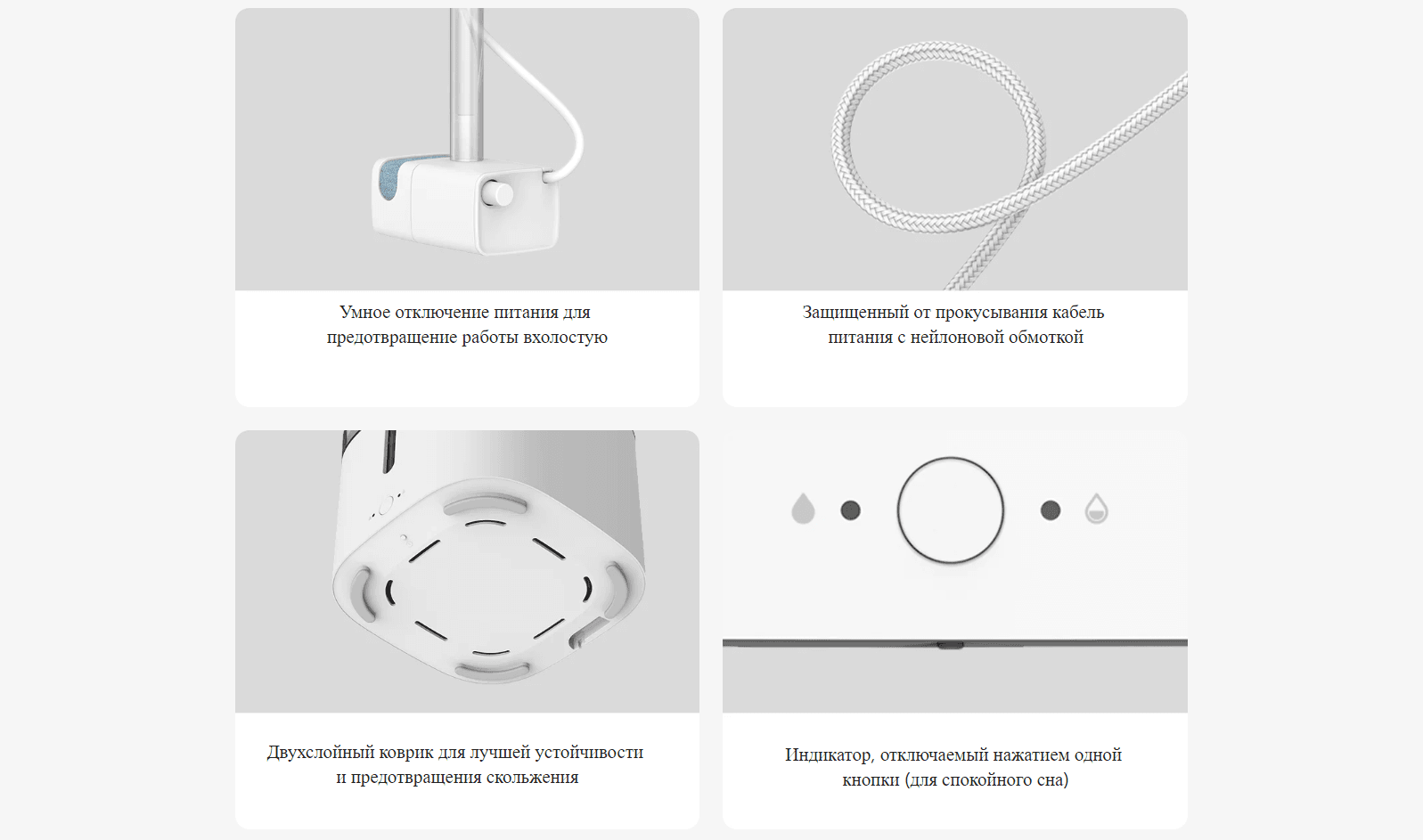 Безопасность устройства детально продумана: умное отключение питания для предотвращение работы вхолостую, кабель питания с нейлоновой обмоткой, противоскользящий коврик и индикатор режимов, который можно отключить через приложение Mi Home/Xiaomi Home.