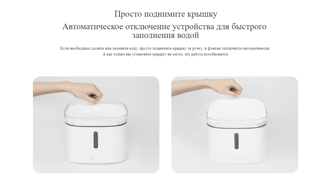 Если необходимо долить или заменить воду, просто поднимите крышку за ручку, и фонтан отключится автоматически. А как только вы установите крышку на место, его работа возобновится.