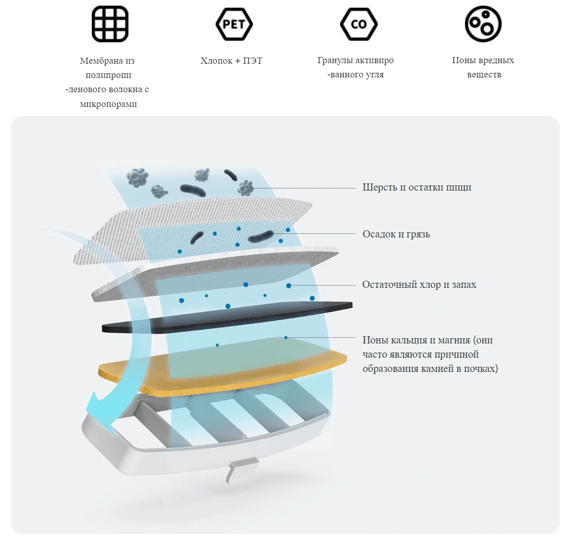 Благодаря глубокой четырехступенчатой системе очистки мельчайшие частицы, волоски шерсти, остаточный хлор, а также ионы кальция и магния, которые вызывают образование камней в почках, эффективно улавливаются и отфильтровываются. В результате получается полезная и вкусная вода.