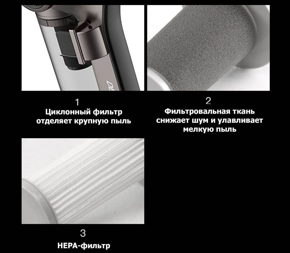 Используемая в пылесосе Deerma новая технология циклонной фильтрации сочетает в себе несколько завихрений, в которых от воздуха отделяется пыль, волосы и другие крупные частицы. В такой системе невозможно образование засоров, а значит и сила всасывания со временем не теряется.