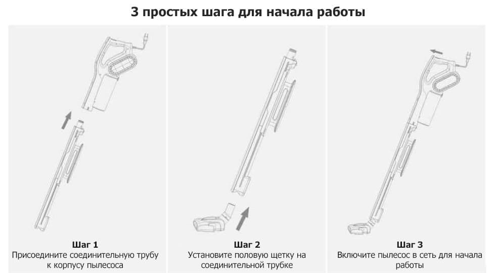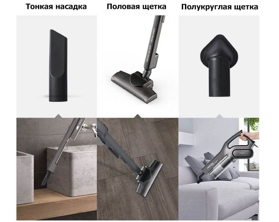 | Комплектация | Вертикальный ручной пылесос, основная насадка, тонкая насадка, щетка с круглым носиком, руководство по эксплуатации |