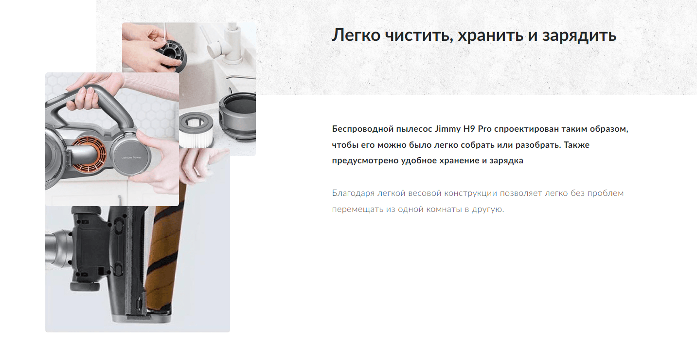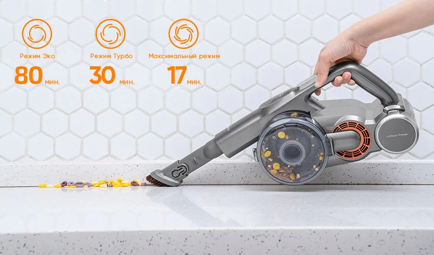 JIMMY H9 PRO оснащен действительно емкой съемной батареей, которая обеспечивает устройству до 80 минут работы в беспроводном режиме (на минимальной скорости). В Турборежиме девайс пылесосит до 30 минут. При этом заряд восполняется достаточно быстро – всего за 4-5 часов.