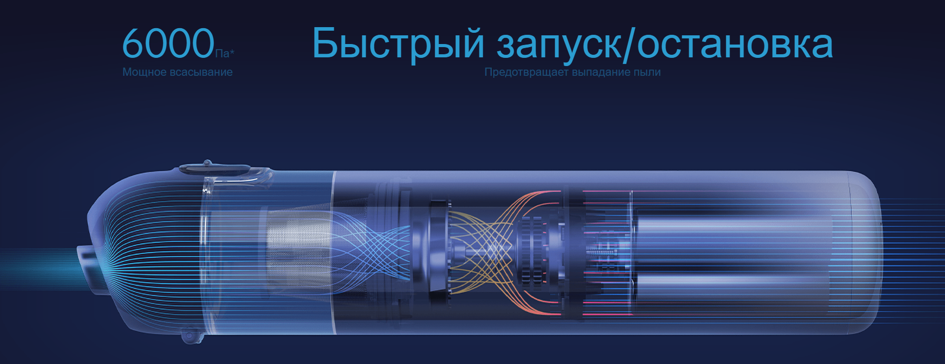 Высокоэффективный бесщеточный мотор и прямая конструкция с двумя вентиляционными отверстиями снижают потери энергии и повышают эффективность очистки. Функция быстрого запуска/остановки не дает пыли оставаться во всасывающем отверстии при выключении устройства.