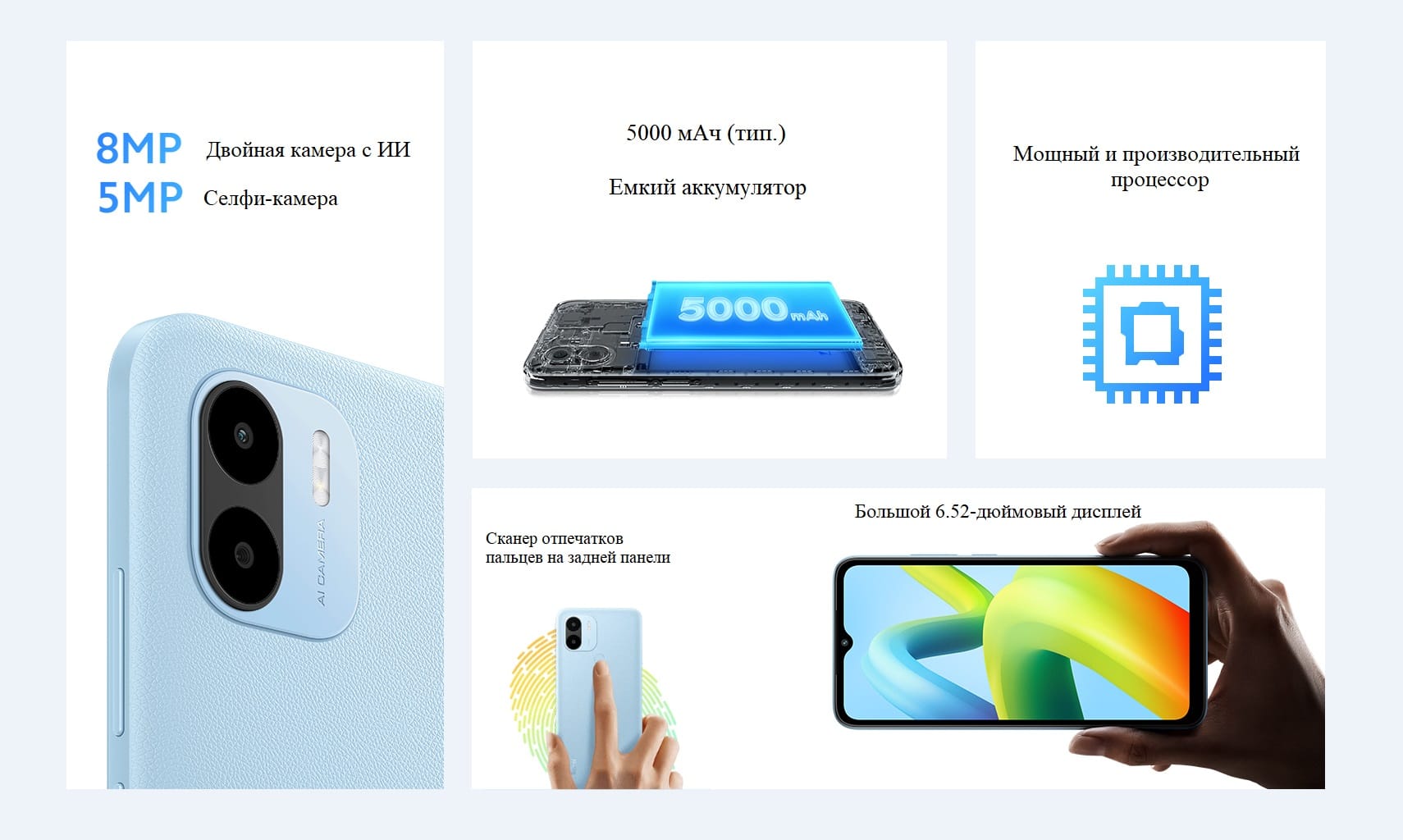 | Комплектация | Redmi A1+, адаптер питания, USB-кабель, инструмент для извлечения SIM-карты, руководство пользователя |