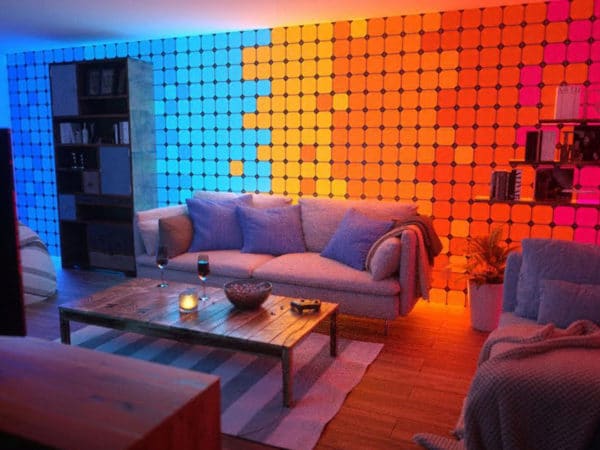 Умная система освещения состоит из 9 квадратных панелей белого цвета. Длина одной стороны – 15 сантиметров Панели монтируются на стену или потолок и подключаются друг к другу в произвольном порядке. К сети получается только одна из панелей, остальные получают энергию по цепочке. Внешняя часть панелей сенсорная, чтобы пользователь мог управлять системой освещения касаниями.
