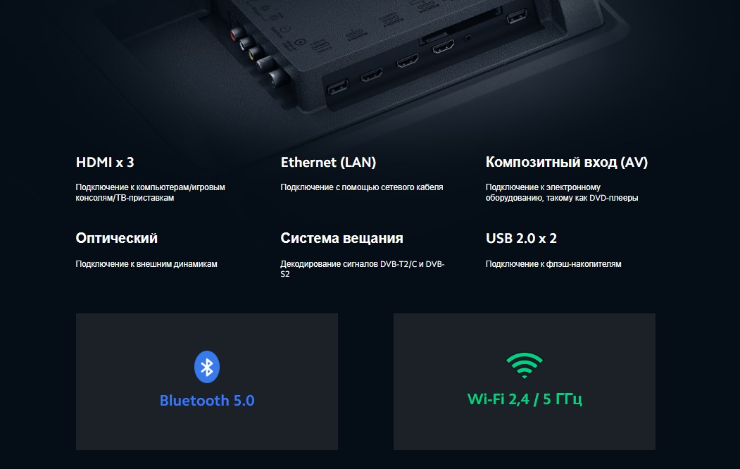 | Особенности | Безрамочный дизайн, Встроенный Wi-Fi, Встроенный Bluetooth, Телетекст, Поддержка SMART TV, Игровой режим, Голосовое управление, Управление со смартфона, Настенный монтаж |