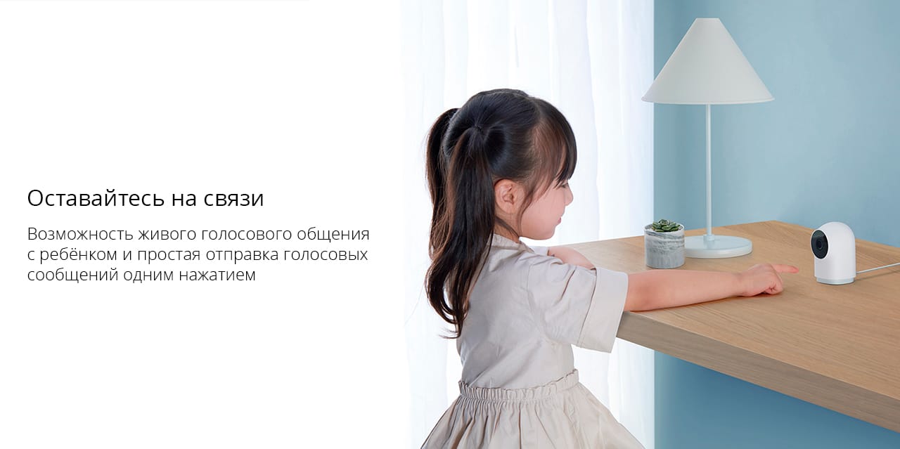 Камера оснащена достаточно громким динамиком и микрофоном, с шумоподавлением и расстоянием захвата до 5 метров, благодаря чему её можно использовать для связи с ребёнком. Зажав многофункциональную кнопку на 3 секунды, можно записать видеосообщение, которое отправится на смартфон. Кроме того, поддерживается возможность общаться и в реальном времени.