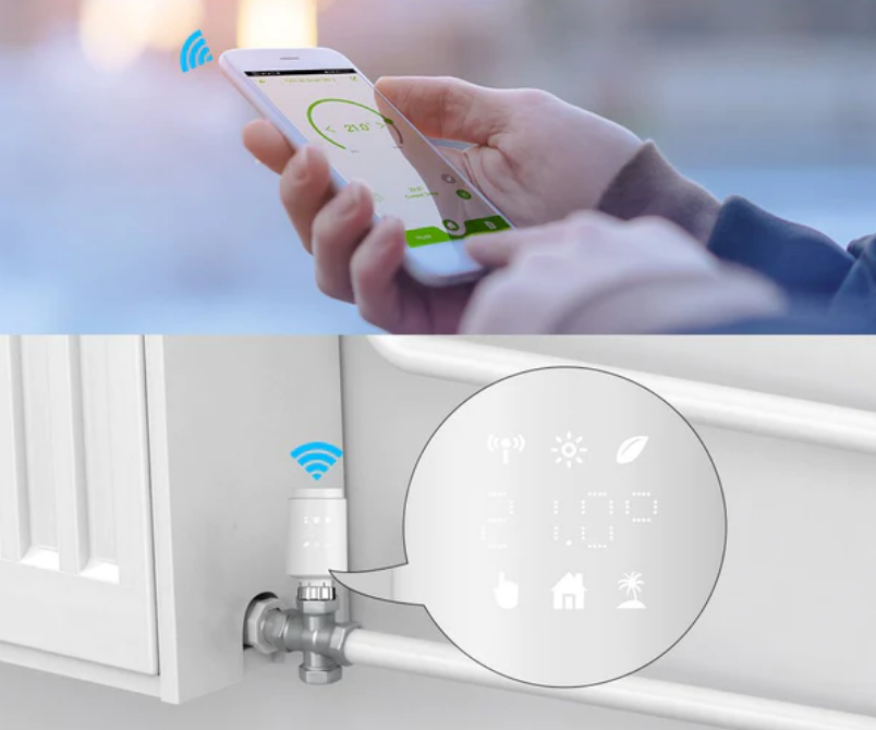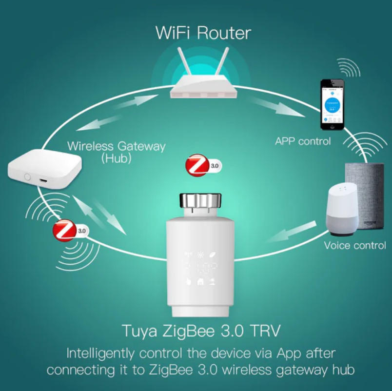 Это умный термостатный клапан, который предназначен для управления радиаторными отопительными системами в доме. Он использует технологию ZigBee для беспроводного соединения с другими устройствами в умном доме, что позволяет вам контролировать температуру в помещении с помощью смартфона или голосового помощника. Управляется с помощью вращения корпуса и мобильного приложения.