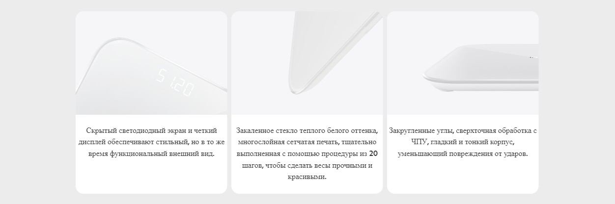 | Особенности весов | Автоматическое включение/отключение, Индикатор перегрузки, Автоматическая идентификация пользователя, Возможность совместного использования 16 пользователями, Гостевой режим, Взвешивание предметов, Вставки против скольжения, Прорезиненные ножки, Отслеживание данных в приложении Mi Fit |
