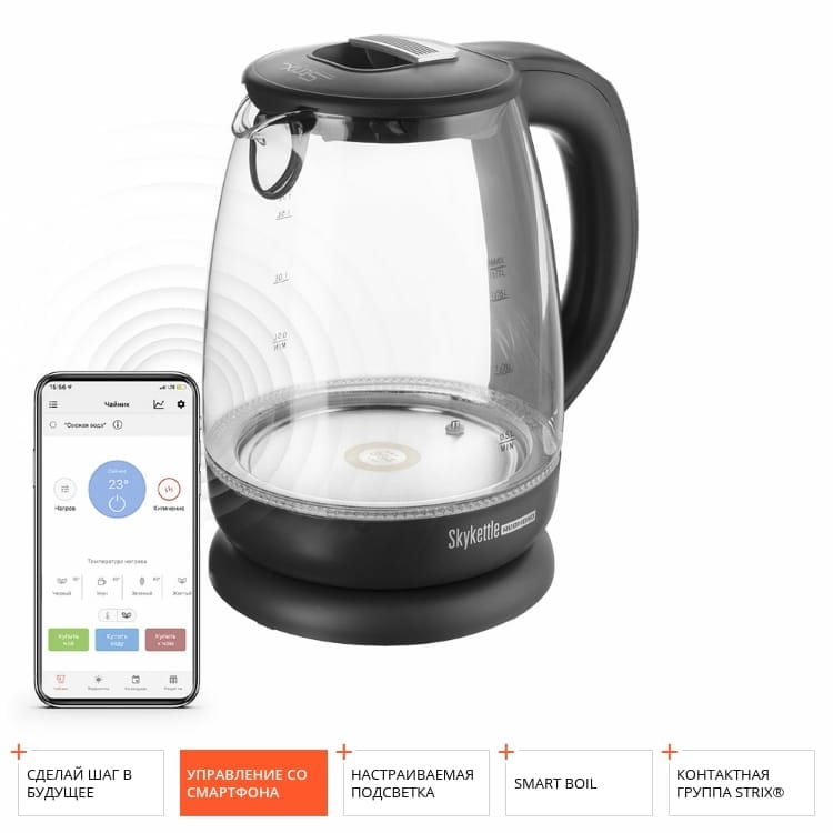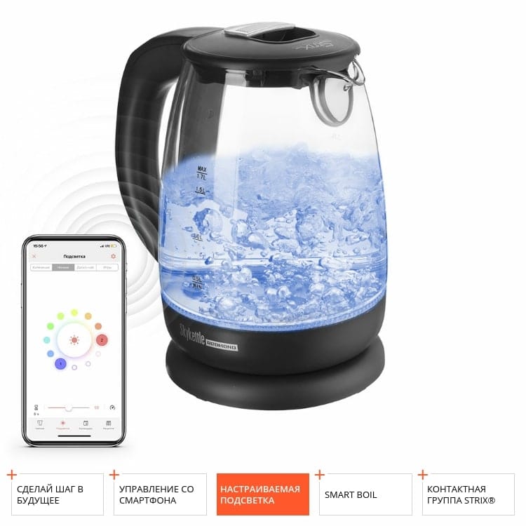 SkyKettle G210S оснащен программируемой светодиодной подсветкой. Поэтому чайник может выполнять функции светильника, ночника, светомузыки для домашних вечеринок и даже игрового гаджета для детей. Со смартфона вы можете: