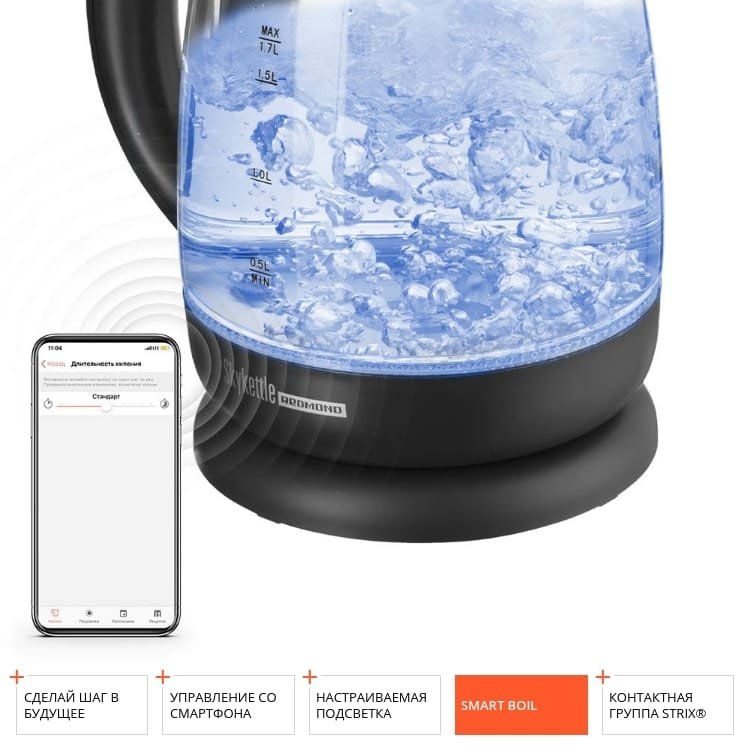 Контролируйте со смартфона интенсивность кипячения воды в чайнике – это позволит избежать обильного парообразования и добиться оптимального уровня минерализации кипяченой воды. Интенсивно кипятите жесткую водопроводную воду, и наоборот снизьте интенсивность, для сохранения естественного уровня минерализации очищенной артезианской воды.