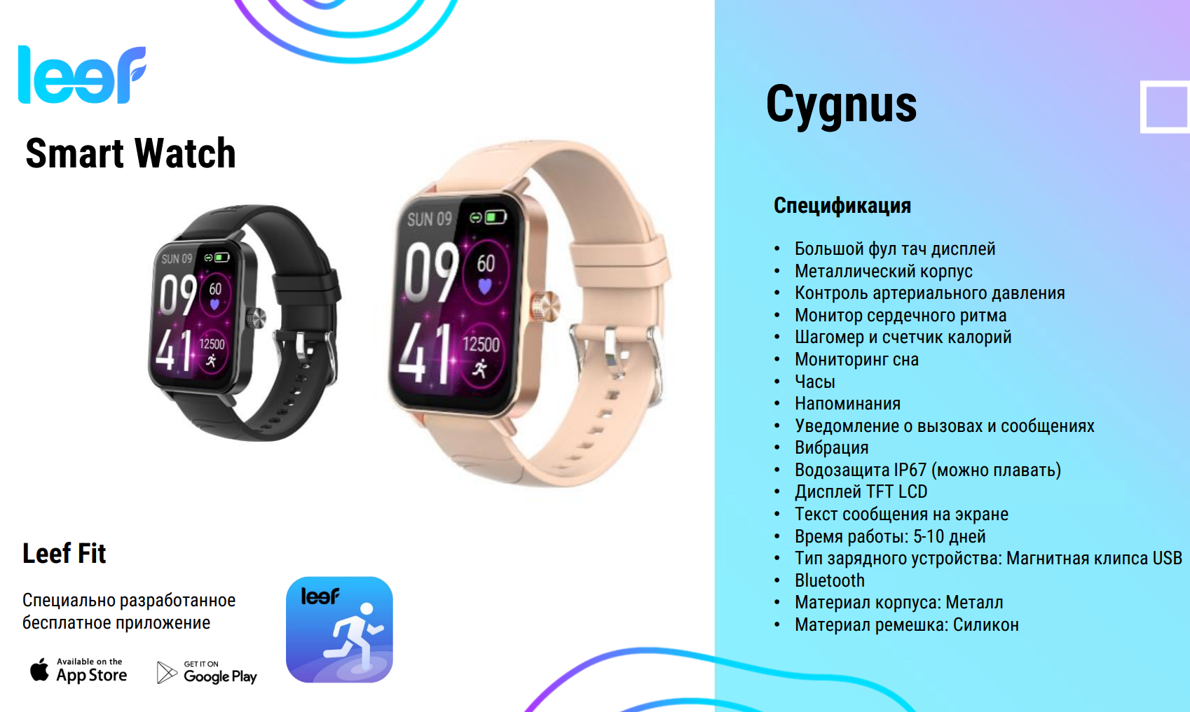 | Комплектация | Умные часы LEEF Cygnus, кабель для зарядки, инструкция |