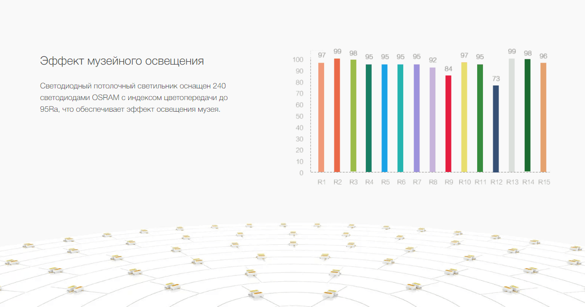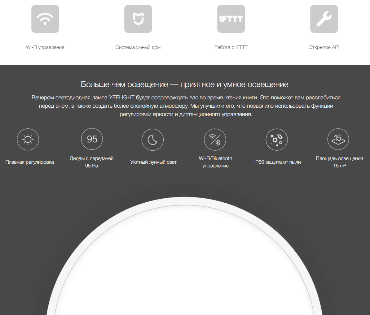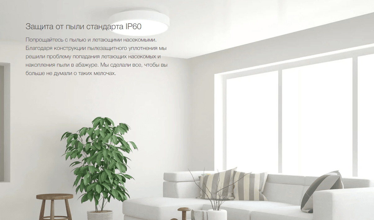 | Особенности | Защита от пыли и насекомых (IP60), Подключается к системе Умного дома, Регулировка яркости, Ночной и дневной свет, Режим лунного света, Несколько сцен освещения, Простая установка |