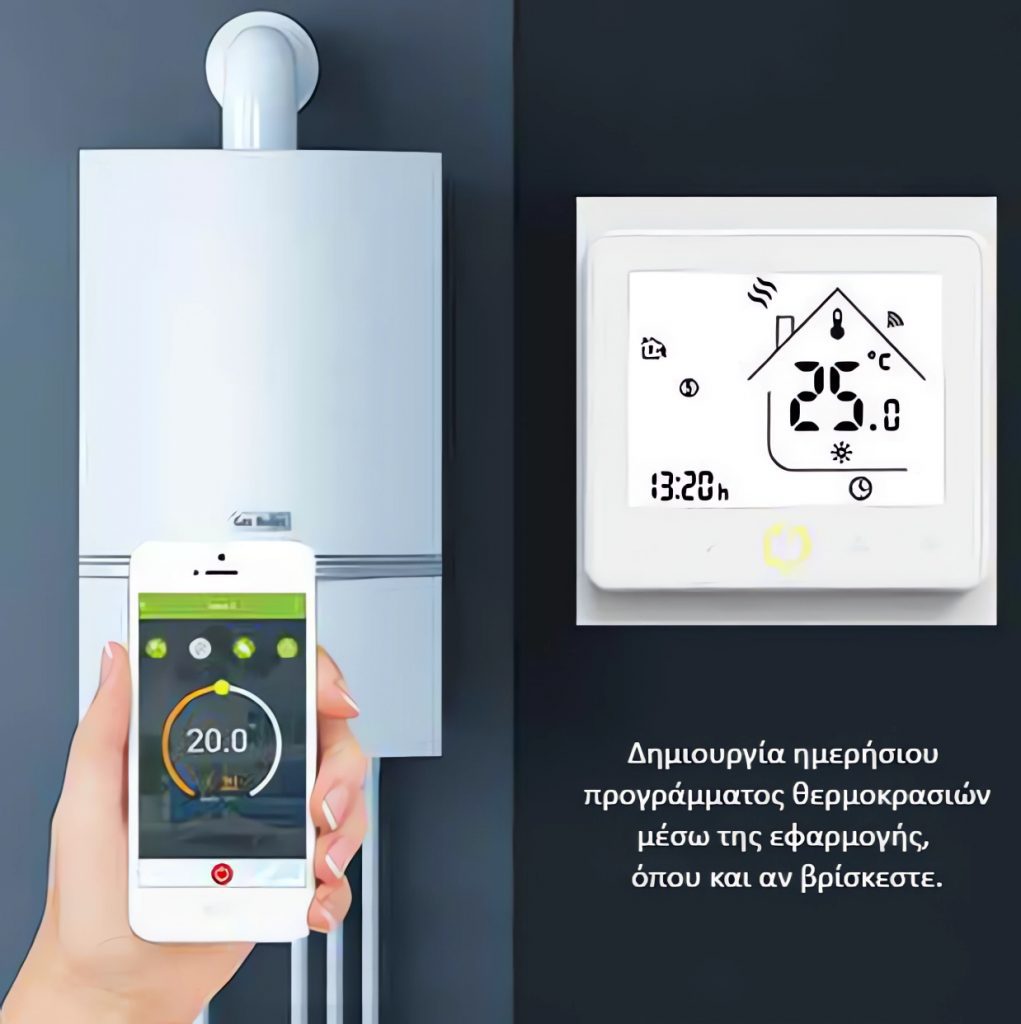 Умный термостат, который работает по протоколу WiFi 2.4Ггц и предоставляет возможность управления температурой в помещении.