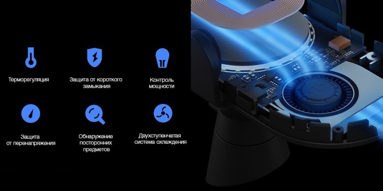 Лицевая поверхность зарядки выполнена из цельного 2.5D-стекла, которое повышает эффективность системы теплоотведения смартфона. Подключение устройства к источнику питания и готовность к работе обозначаются ярким синим индикатором.