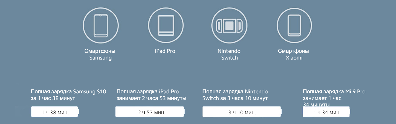 Быстрая зарядка для различных популярных устройств, включая Samsung S10, iPad Pro и Nintendo Switch, с поддержкой нескольких протоколов быстрой зарядки.