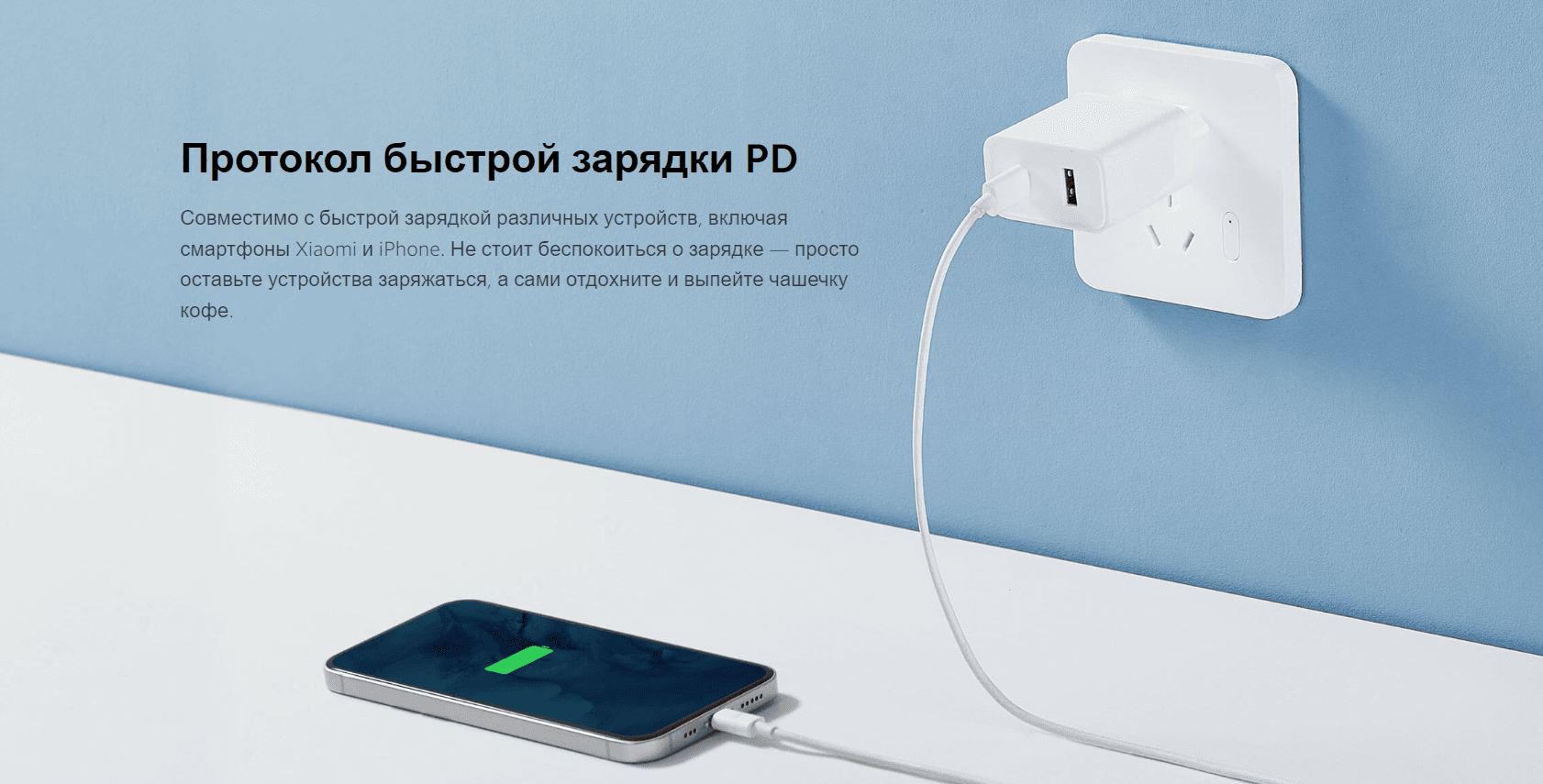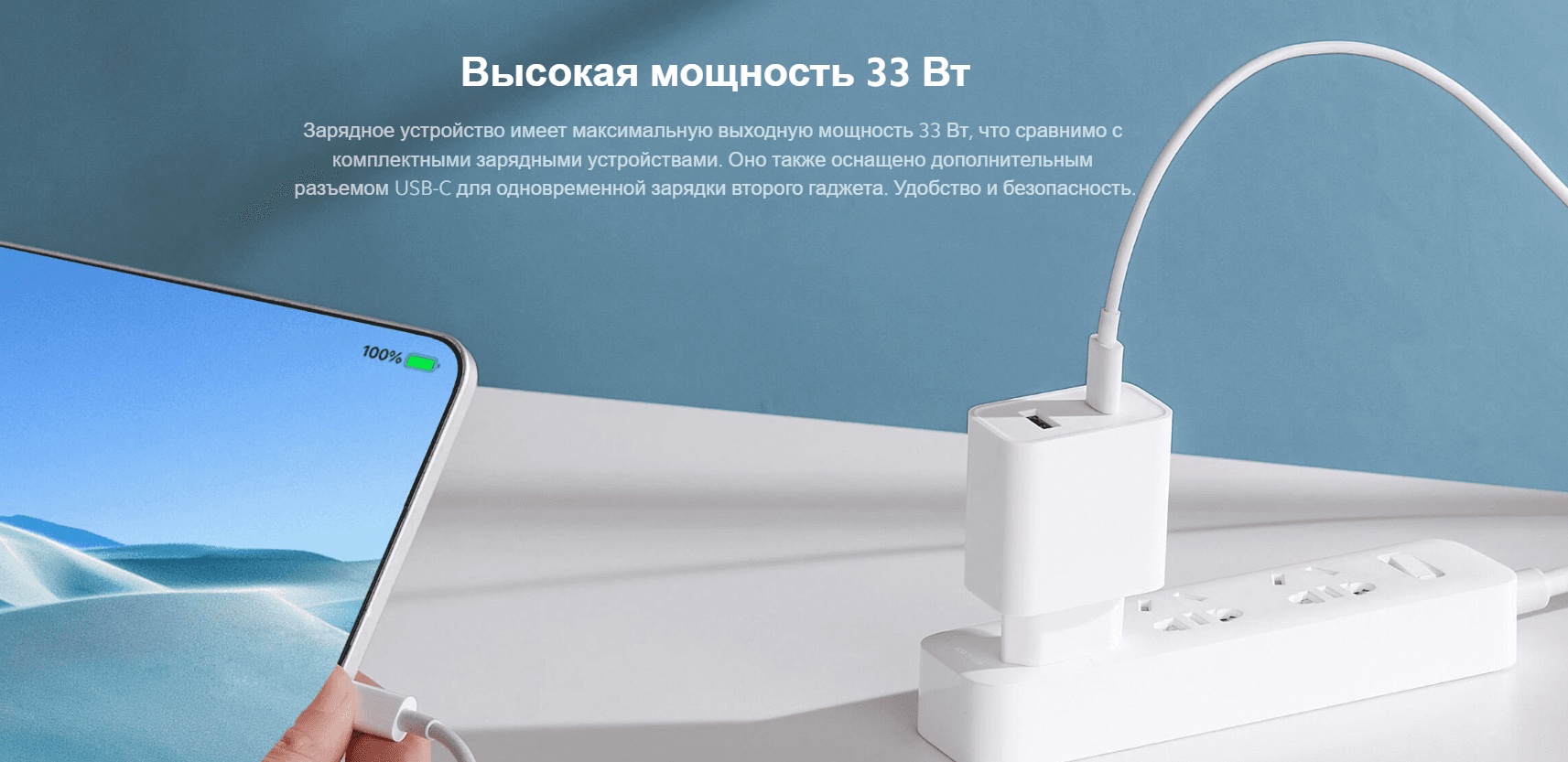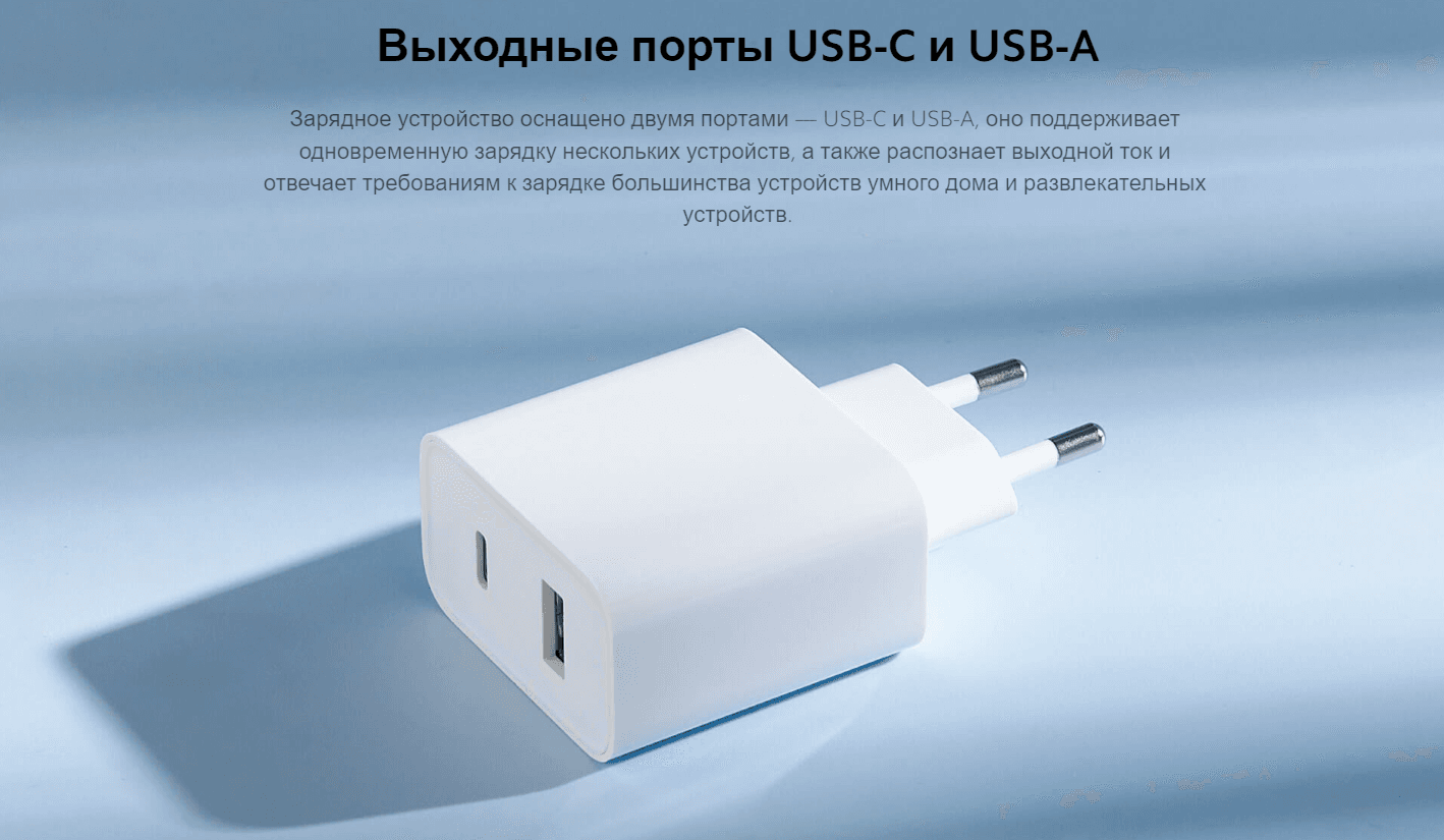 Зарядное устройство оснащено двумя портами — USB-C и USB-A, оно поддерживает одновременную зарядку нескольких устройств, а также распознает выходной ток и отвечает требованиям к зарядке большинства устройств умного дома и развлекательных устройств.