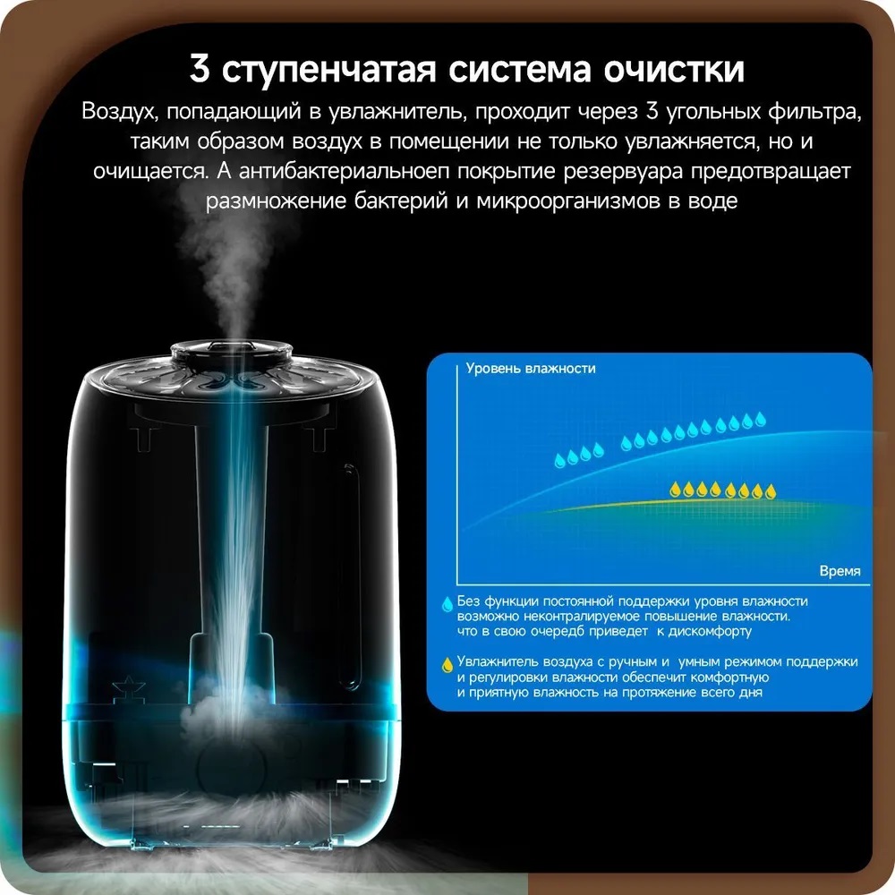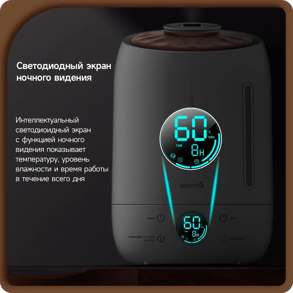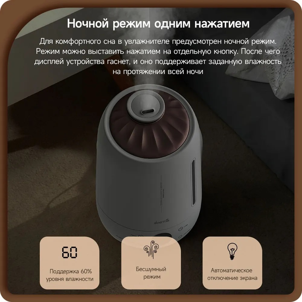 | Особенности | Встроенный LED-дисплей, Ароматизация воздуха, 12 часов увлажнения от одной заправки, 3 режима интенсивности испарения, ночной режим с минимальным уровнем шума |