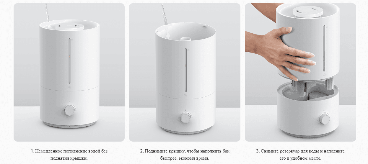 Теперь вы можете заправлять увлажнитель сверху без сложного подъема крышки. Благодаря индикатору воды вы можете сразу увидеть уровень воды. Идеальный выбор для пожилых людей, доливая воду, не наклоняясь.