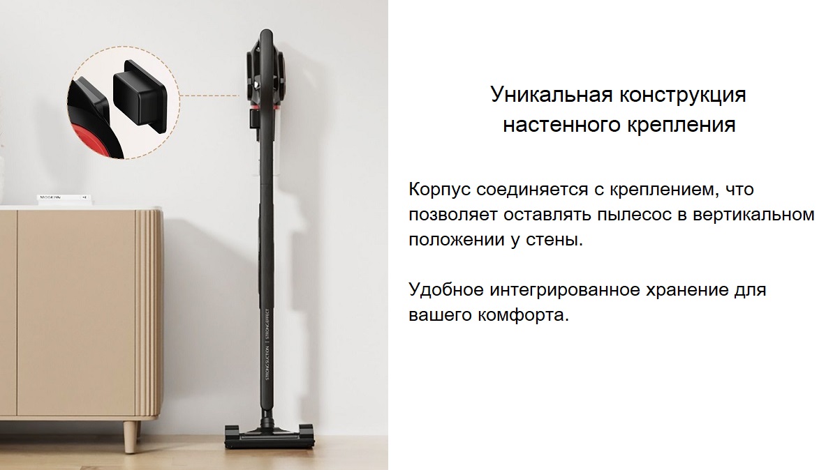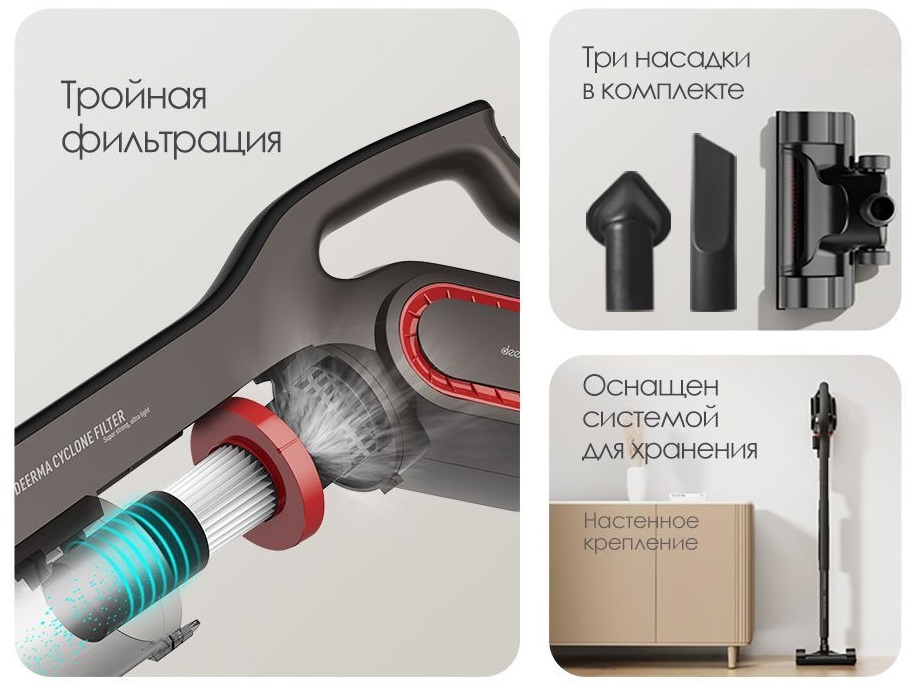 | Комплектация | Пылесос вертикальный, трубка, настенное крепление, универсальная насадка, насадка с щеткой, плоская насадка, инструкция |