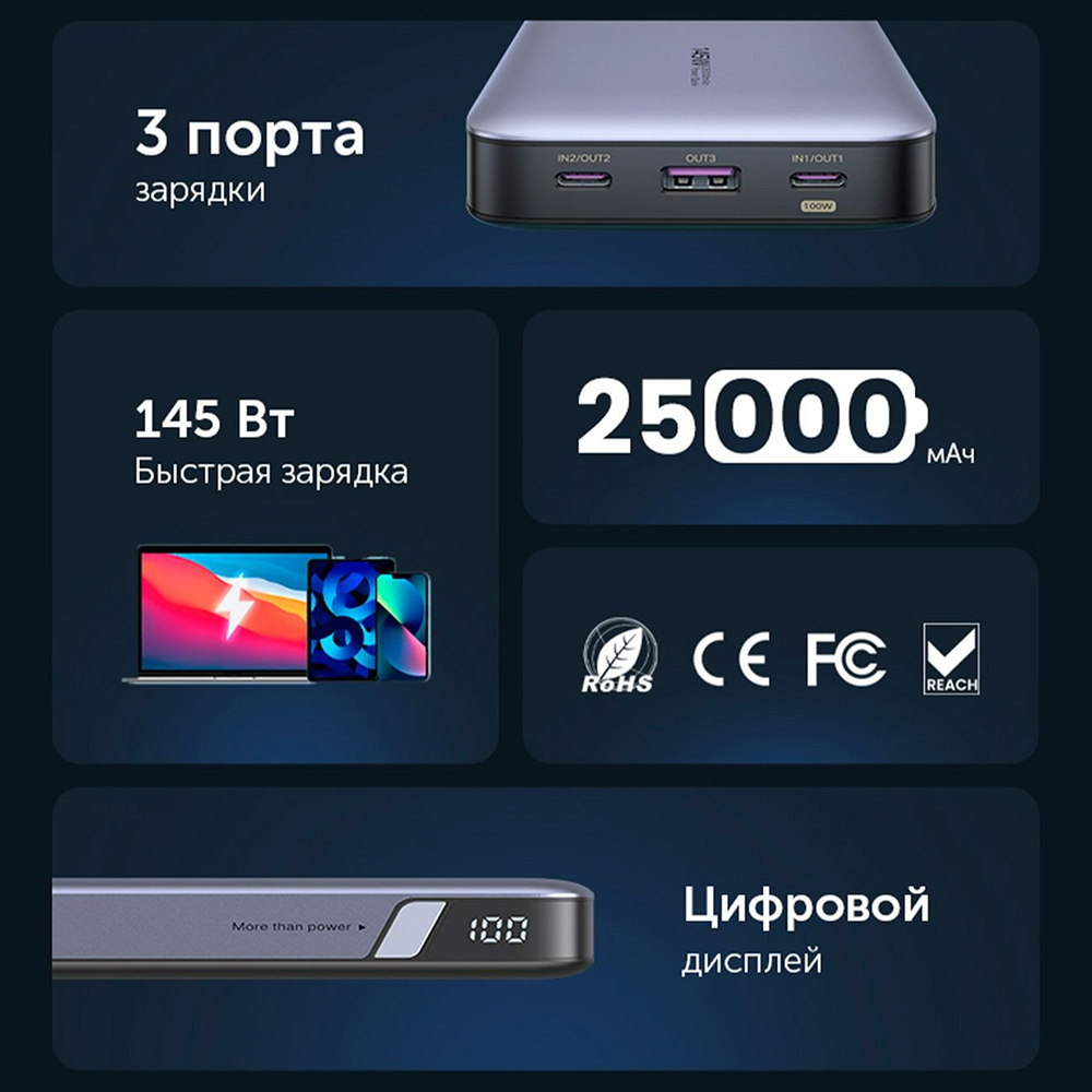 Внешний аккумулятор UGREEN PB205 (90597A) PD 145W Power Bank 25000mAh. Цвет: серый