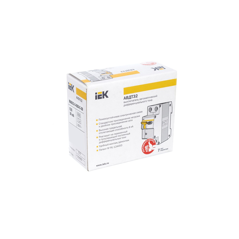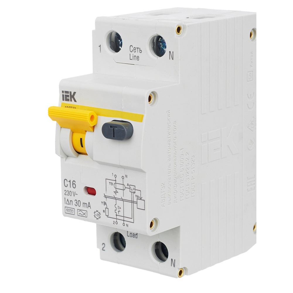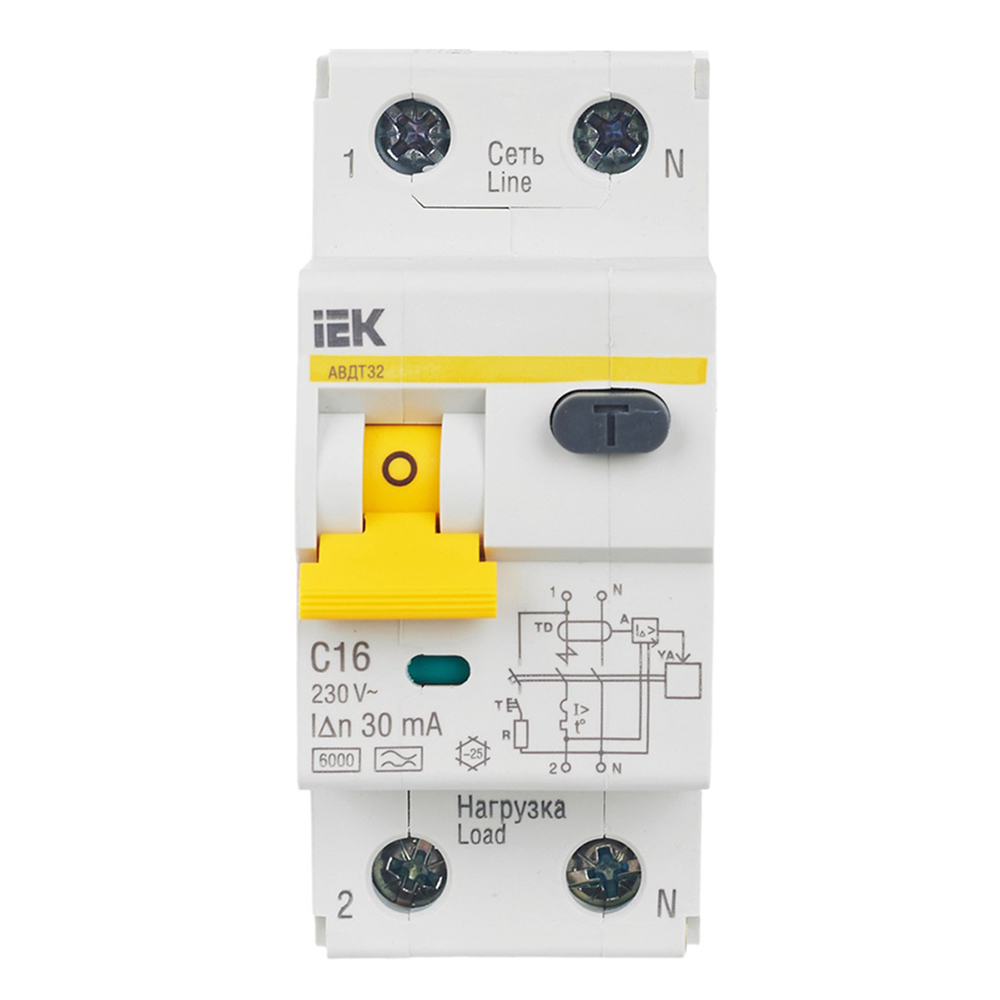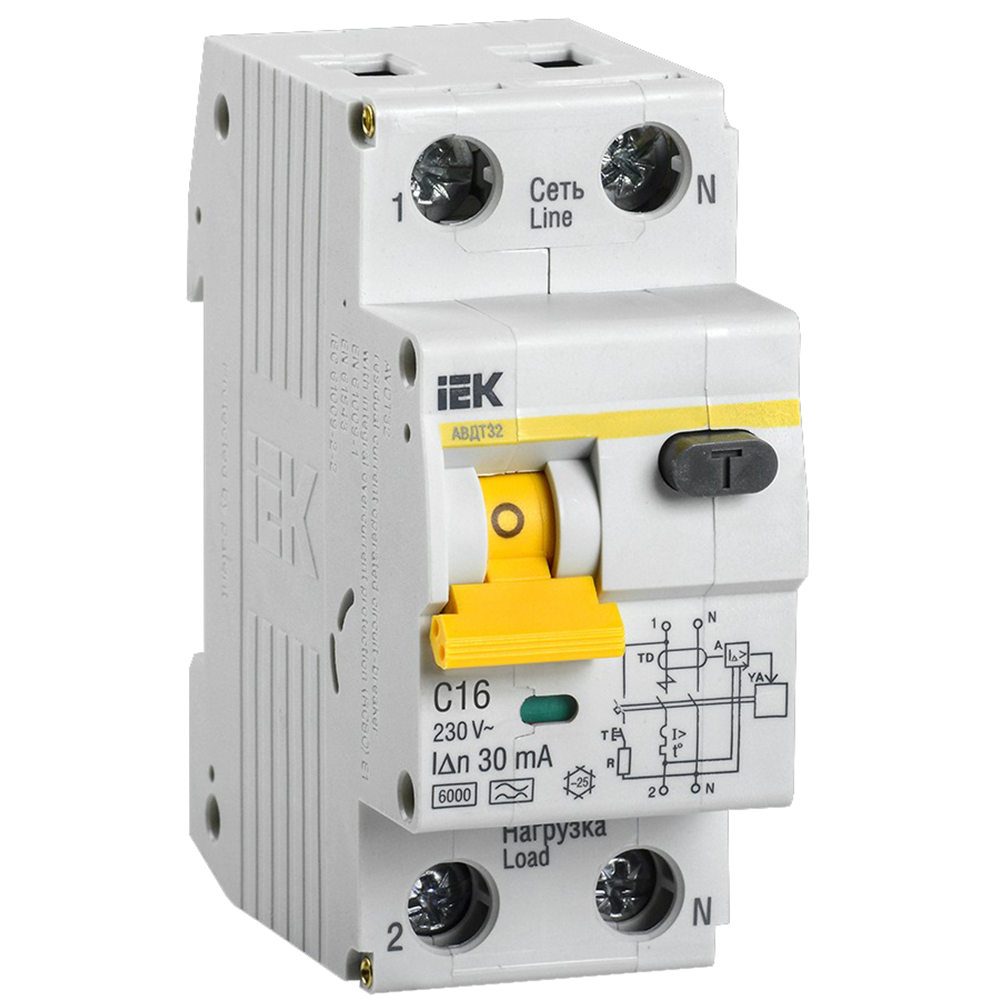 Выключатель автом. дифф. тока IEK АВДТ 32 (MAD22-5-016-C-30) 16A тип C 6kA 30мА A 1П+Н 230В 2мод бел
